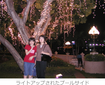 下におりて川沿いを歩きます。ここにはプールが2つあり間にはタイレストランもありましたが、そこを過ぎてシャングルラ・ウイング(本館)の前まで行くとテラス・レストランがあります。その途中の木々はクリスマスのせいか綺麗に電球で飾られていました。テーブルに案内されて飲み物を注文した後はビュッフェですので好きなものを食べ放題です。