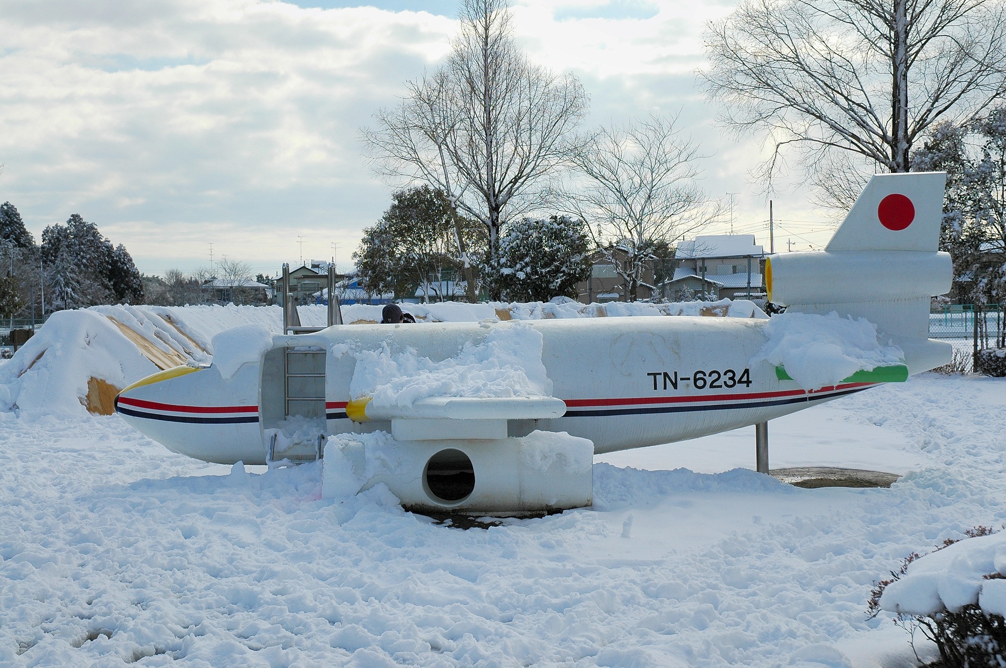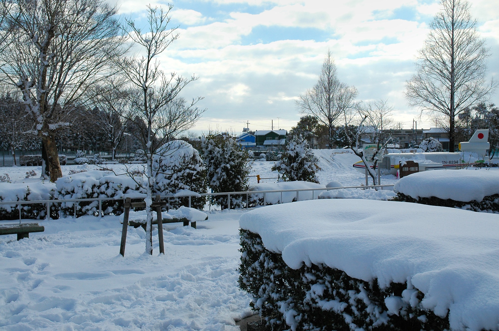 お次はすぐ近くの公園へ行ってみます。ここは通称「飛行機公園」と呼ばれる団地の公園で、子供たちの遊び場になっています。見ると広い公園も一面真っ白。目玉の飛行機の模型も雪に覆われていました。しかし面白いのは公園の中の雪の上には足跡がたくさん。きっと近所の子供たちが喜んで遊んだのでしょう。私が見に行った時には既に誰もいませんでしたが、ちょっぴり微笑ましい光景です。