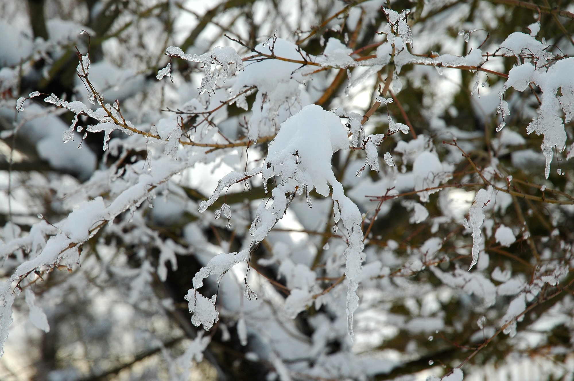 ふと近くの木を見ると、枝が雪をかぶり一部凍っていました。何となく情緒ある眺めでした。