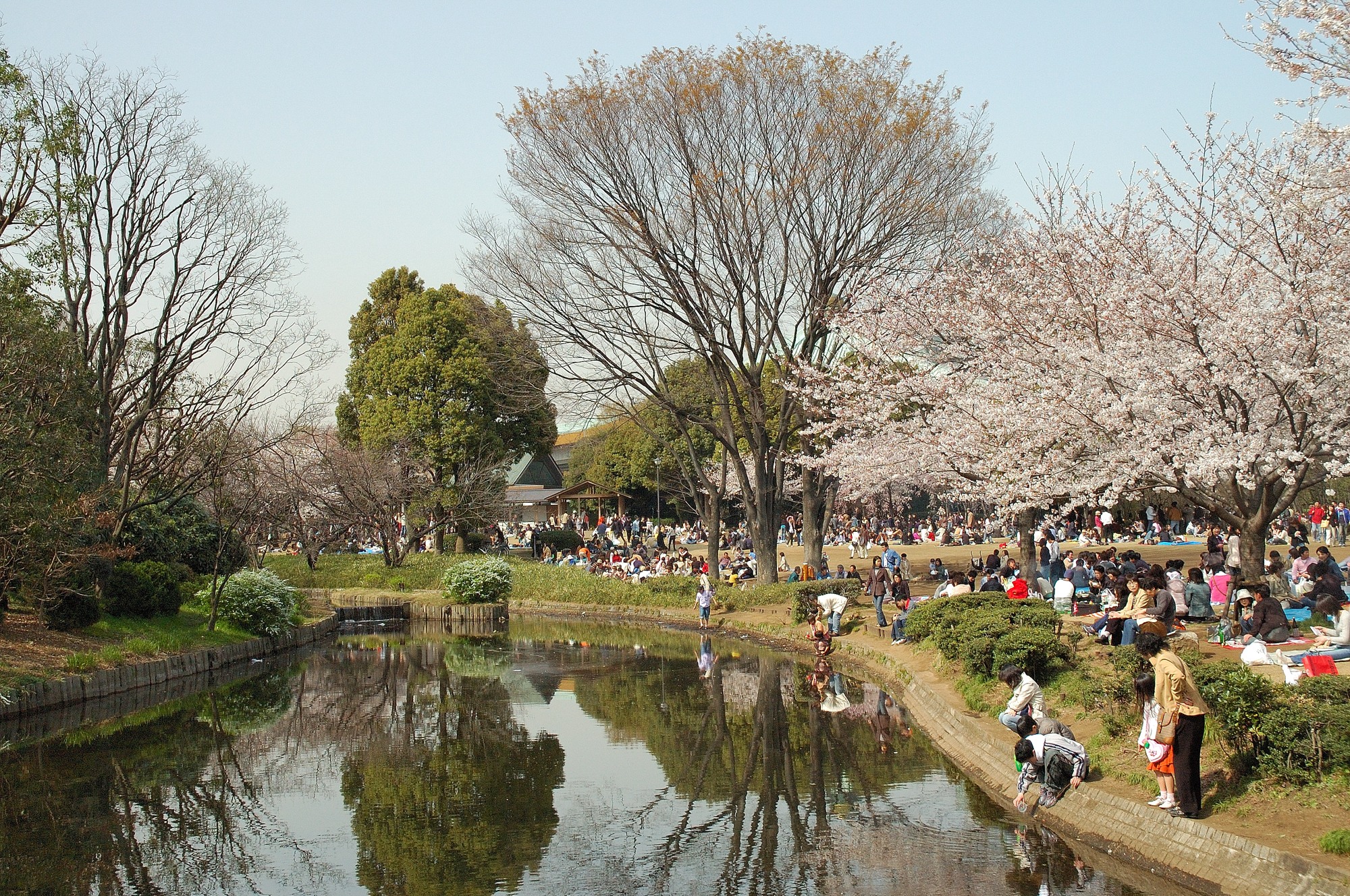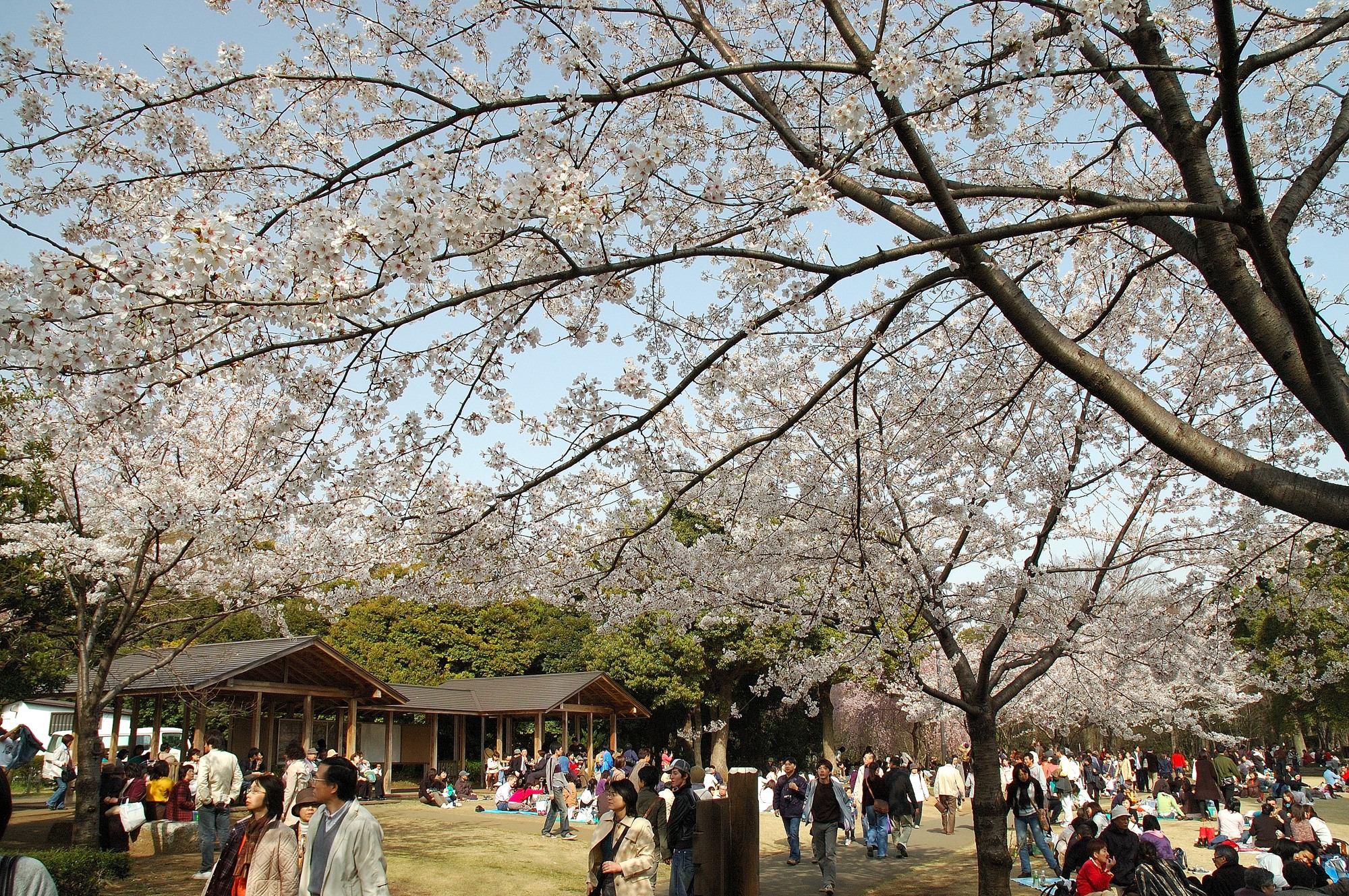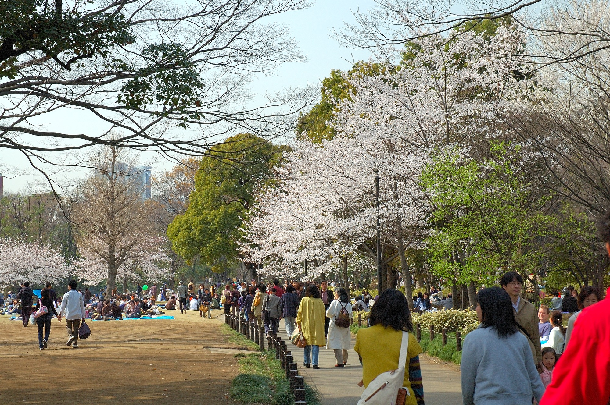 入ってすぐ前方に桜がたくさん見え、わくわくしながら進んでいきますが、予想通り、と言いますか予想以上の人出です。周囲を見ると昼ということもあり、多くの人が歩いている脇でこれまた大勢の人たちがグループ単位で広場に座ってお弁当を食べています。都心のこういう場所でこんなにのんびり出来る所はあまりないでしょう。皆、気持ち良さそうにくつろいでいます。