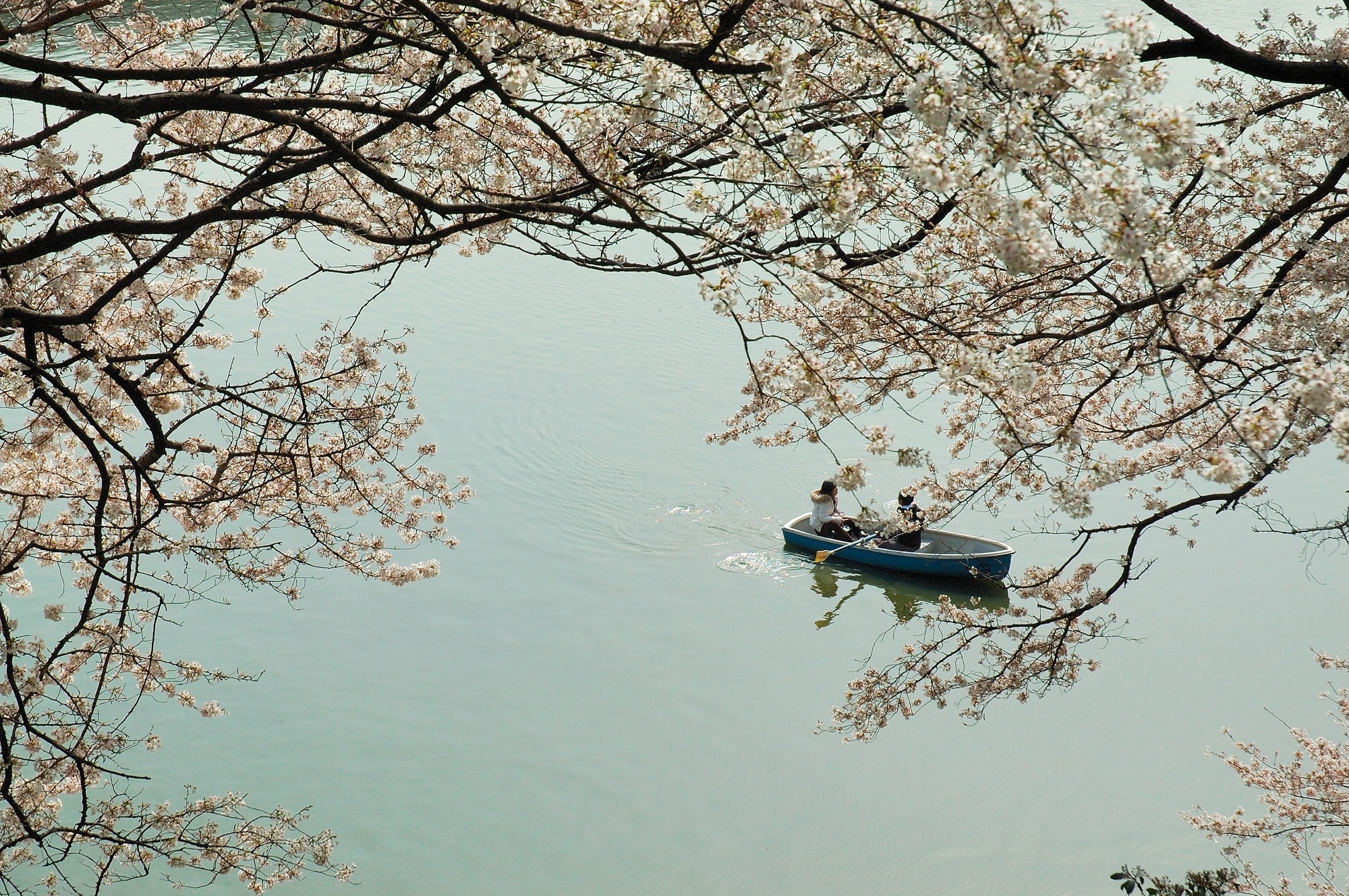 千鳥ケ淵を見下ろすと、いくつかのボートが漂っていました。桜の枝の間に見えるボートというのも結構いい構図で、絵になるものです。乗っている人はさぞかし気持ちいいのだろうな、と羨ましくなりました。