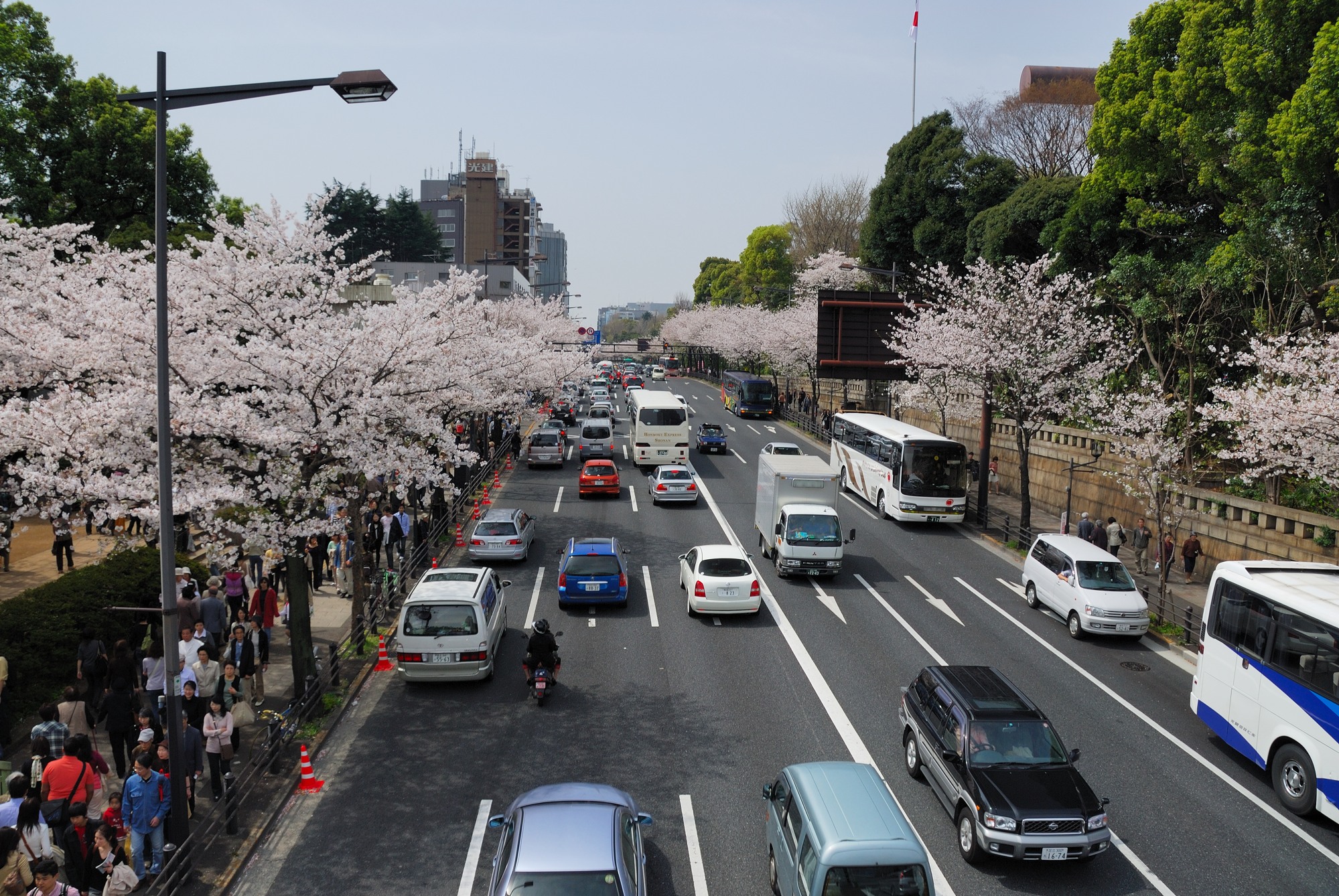 ここまでで桜は充分に堪能しましたので,あとは帰ることにしました。帰り道,先ほどの歩道橋を見ると,相変わらず多くの人が歩いています。