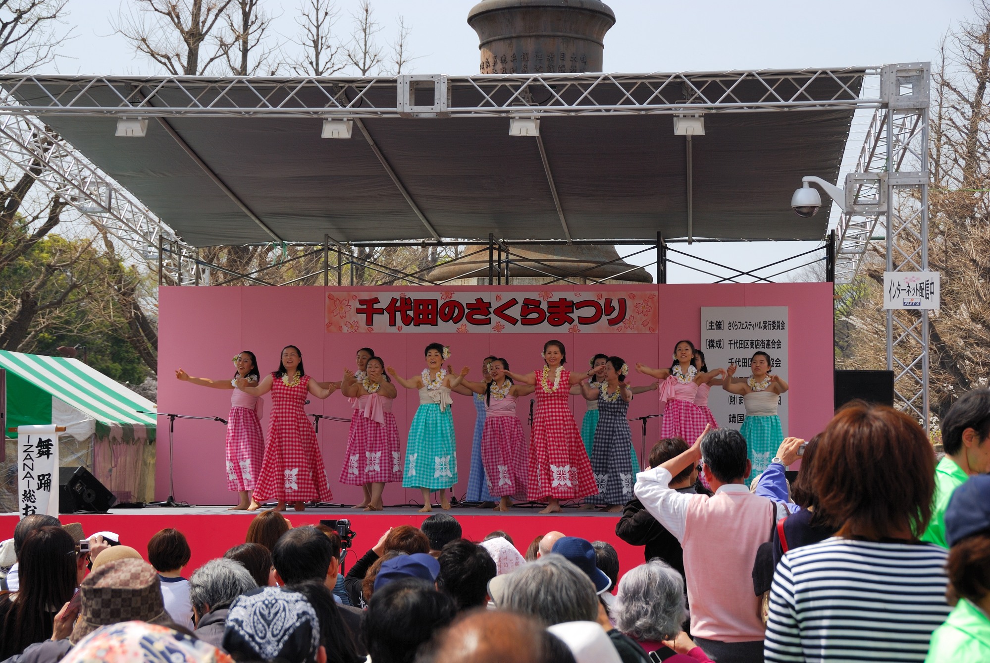 見ると看板には「千代田のさくらまつり」とありました。近くに行って写真を撮ろうと思ってよく見たら,若い女性と思ったのが,実は年配の女性達でした・・・。でも面白いので,少しの間,立ち止まって見ていました。
