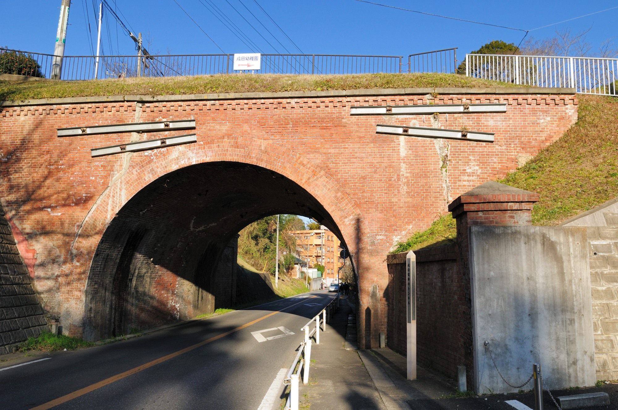 この道路は電車道と言われていて,昔,本当に成田から隣町の宗吾参道まで電車が走っていたようです。途中2箇所レンガのトンネルがあるのは,電車用のトンネルだったらしいです。いつもは車で何気なく走っている道を,たまに歩いてみると面白い発見があるものです。