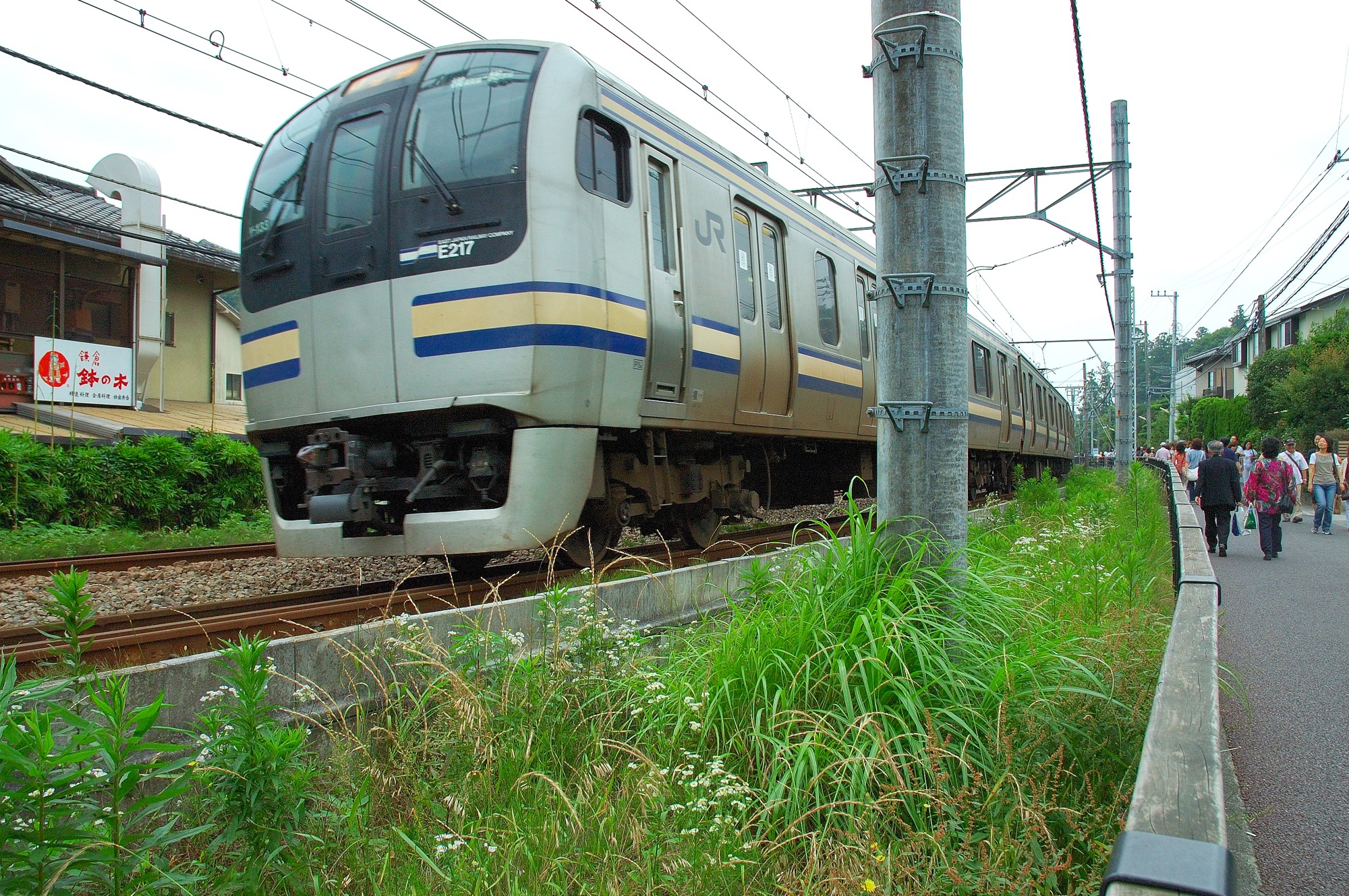 まずJR横須賀線の北鎌倉駅からお隣の鎌倉駅まで移動し、そこから江ノ電に乗ります。この横須賀線は私が普段通勤で使っているJR総武線と直通運転しているので、当然ですが同じ車両が走っています。いつも千葉県で見ているこの車両が鎌倉で走っているのを見ると何となく不思議な感じがしました。駅に向かって歩いているとちょうど電車が走ってきたので、ここでも写真を撮ります。北鎌倉駅から隣の鎌倉駅までは5分たらずで着きますのですぐでした。