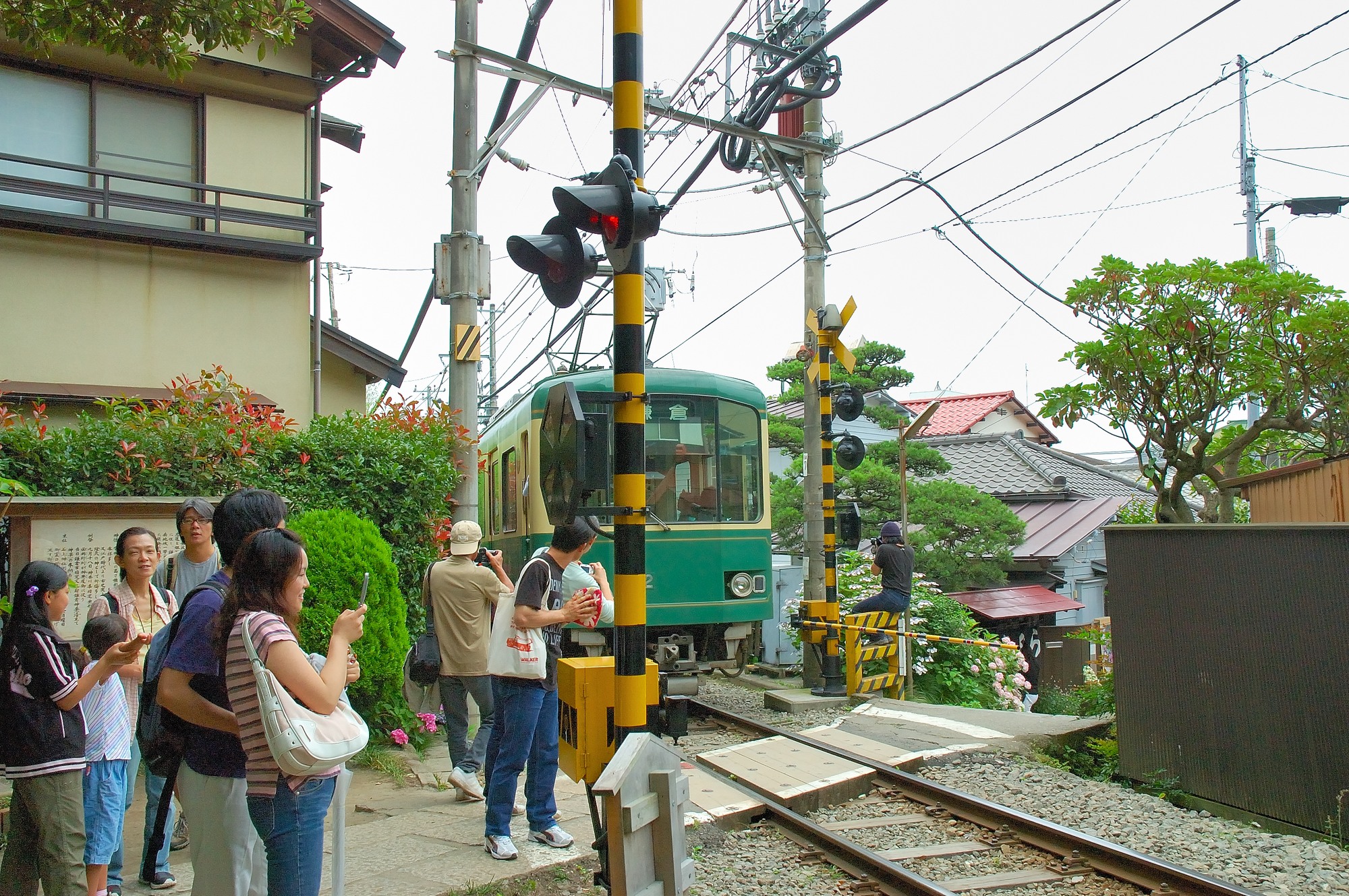 早速私もその列に加わります。神社を背にして見ると、右側にはすぐトンネルがあり、そこから江ノ電が出てくるところを撮影するのが良さそうです。幸運なことにすぐに踏切が鳴りだしました。隣の人に聞いたら、今度はちょうどトンネルから出てくるだろうとのことで、待ち構えていたら確かにトンネル方向から出てきました。踏切が近いということと撮影ポイントであり人が多くいるせいでしょうか、江ノ電はゆっくりと進んできます。何枚か写真を撮りましたが、確かにいい撮影ポイントでした。