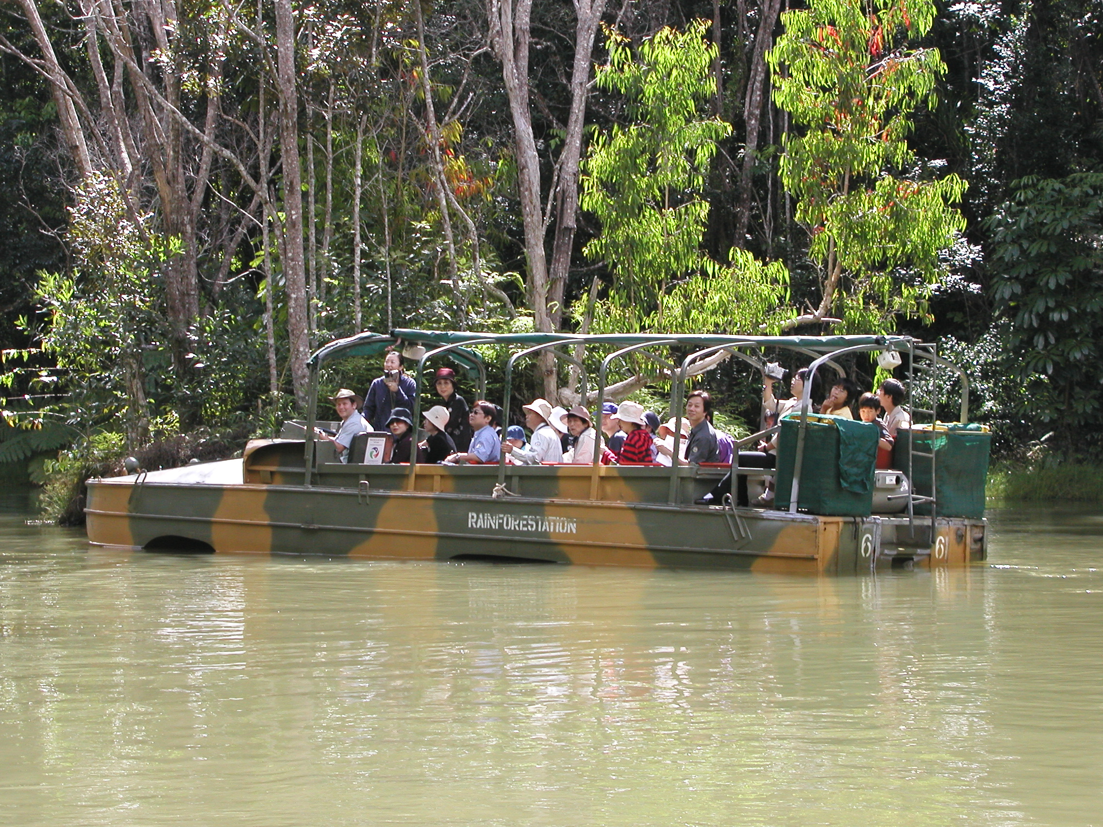 しばらくのんびり食事をしたあとは、水陸両用車による熱帯雨林の探検です。これは20人くらい乗れる大きな6輪駆動車で、2台に分乗して出発です。