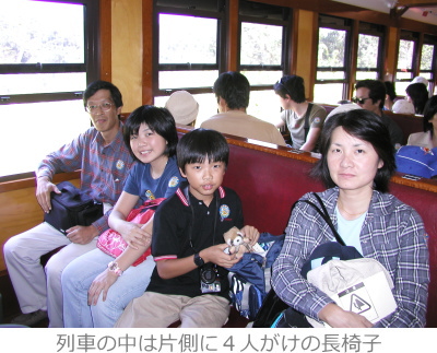 ほんと、来る前から絶対に乗ろうと思っていた高原列車にいよいよ乗ります。「るるぶ」で写真を見ていたらまるでスイスの高原列車みたいでとても素敵だったもので楽しみにしていました。これでアンズまで約1時間半、山並みを抜けて走っていくのです。聞いたところこの列車は、もともと金鉱が発掘されたに伴って引かれたもので、既に100年以上の歴史があります。