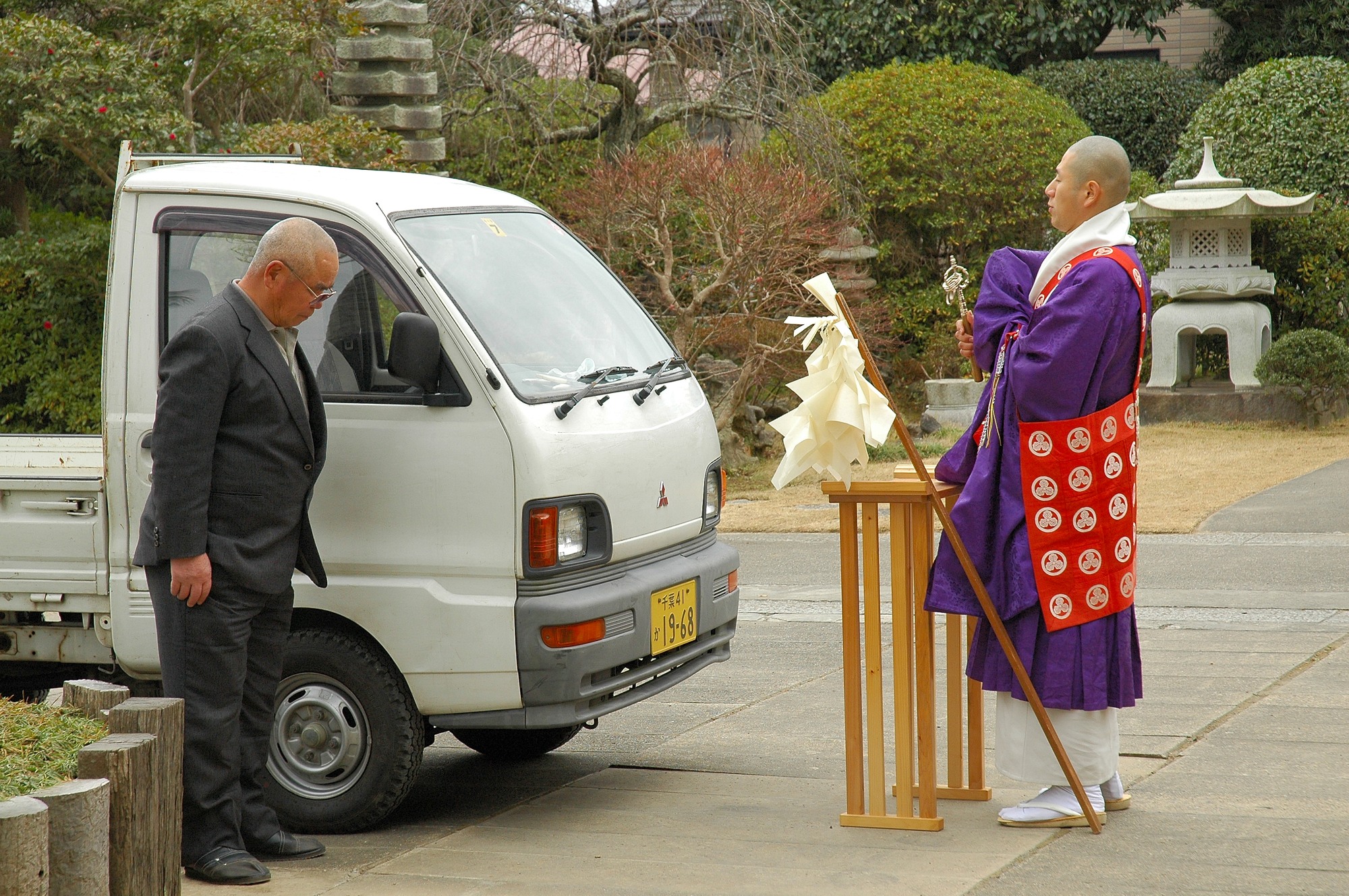 さて拝み終わって下に降りてきたら、今度は車の前でお坊さんが拝んでいます。