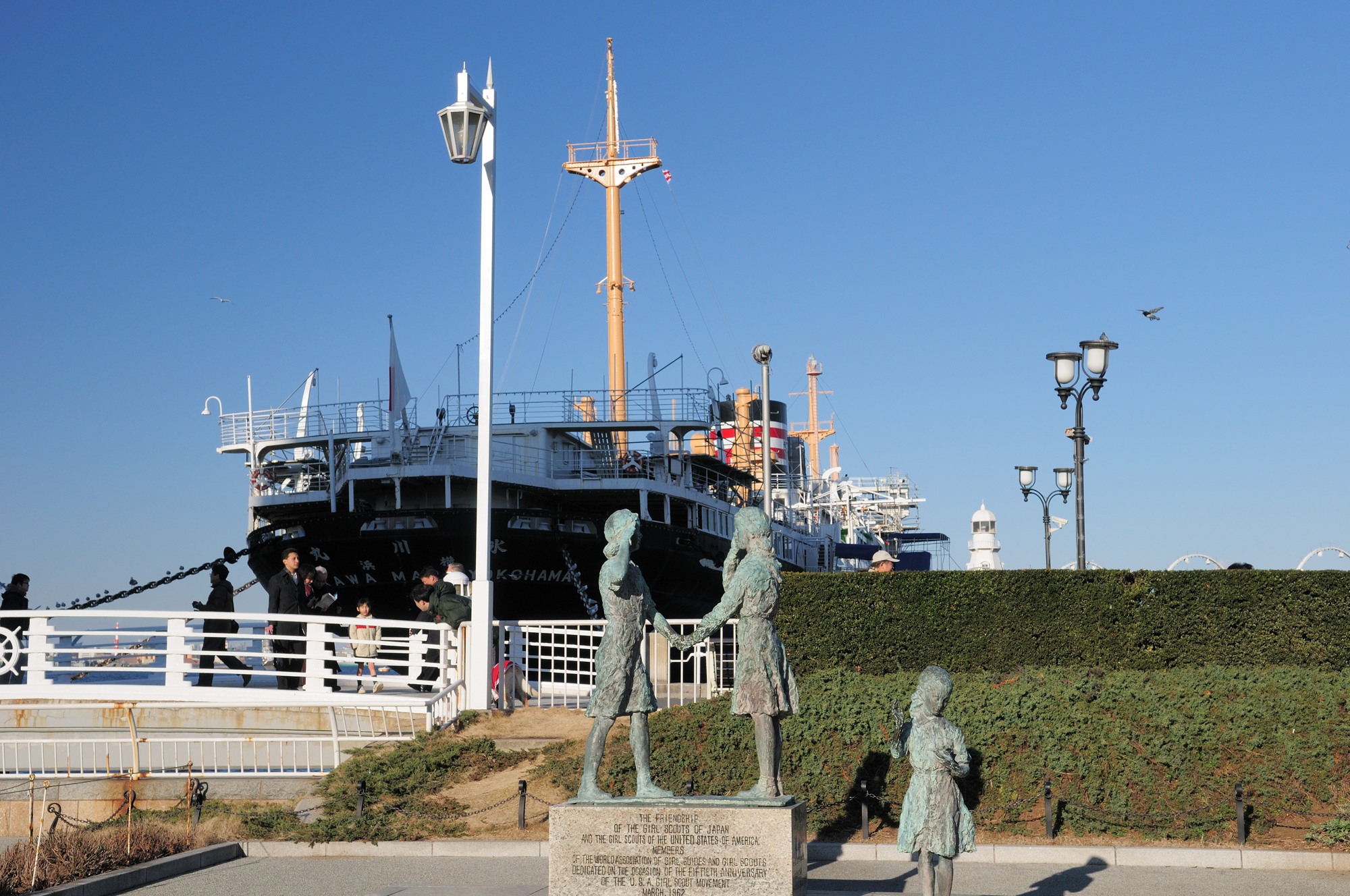 さて奥に進むと,小さな広場があり,そこには赤いバラの花が咲いていました。氷川丸をバックに写真撮影。更に氷川丸の近くに行くと,少女の銅像も建っています。なかなかいい絵になりました。