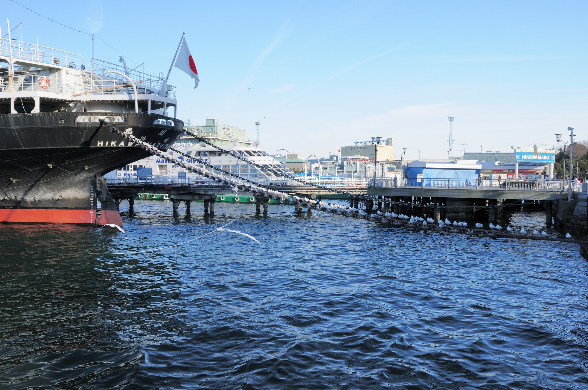氷川丸に近づいて見ると,係留用のチェーンの上に何か乗っています。何だろう? と思いながら近づいて見ます。