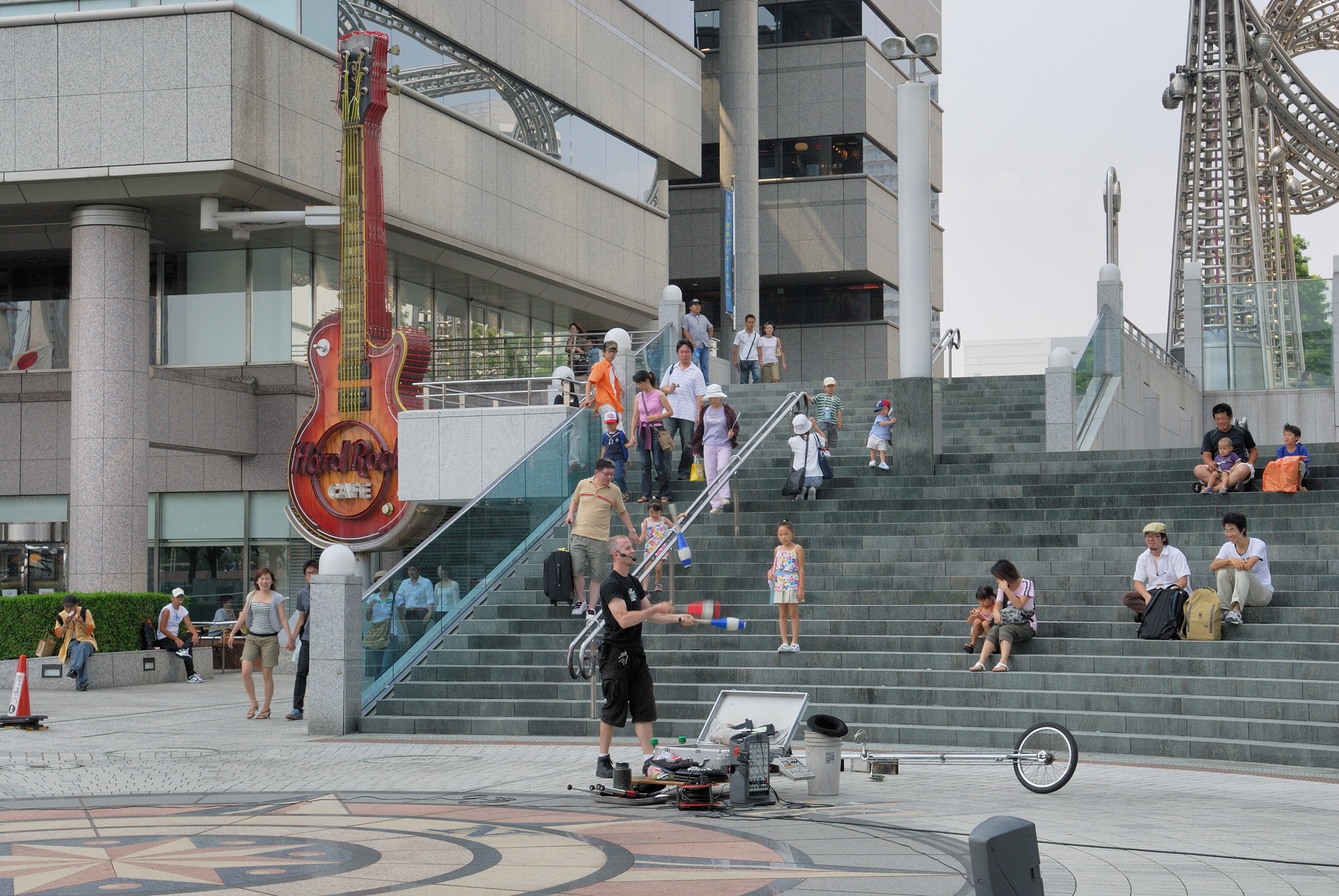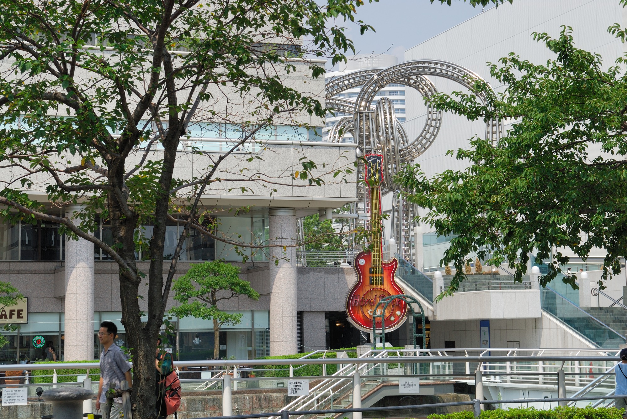 このあたりを歩くのは初めてですが,綺麗な大きいビルの合間に緑がたくさんあり,しかも向かいは遊園地ということで,結構いい感じの通りです。人もたくさんいます。途中見ると,大きなギターが飾ってあるロックカフェがあり,その前では外人さんが曲芸をしたり,若者がロックを演奏していたりしていました。