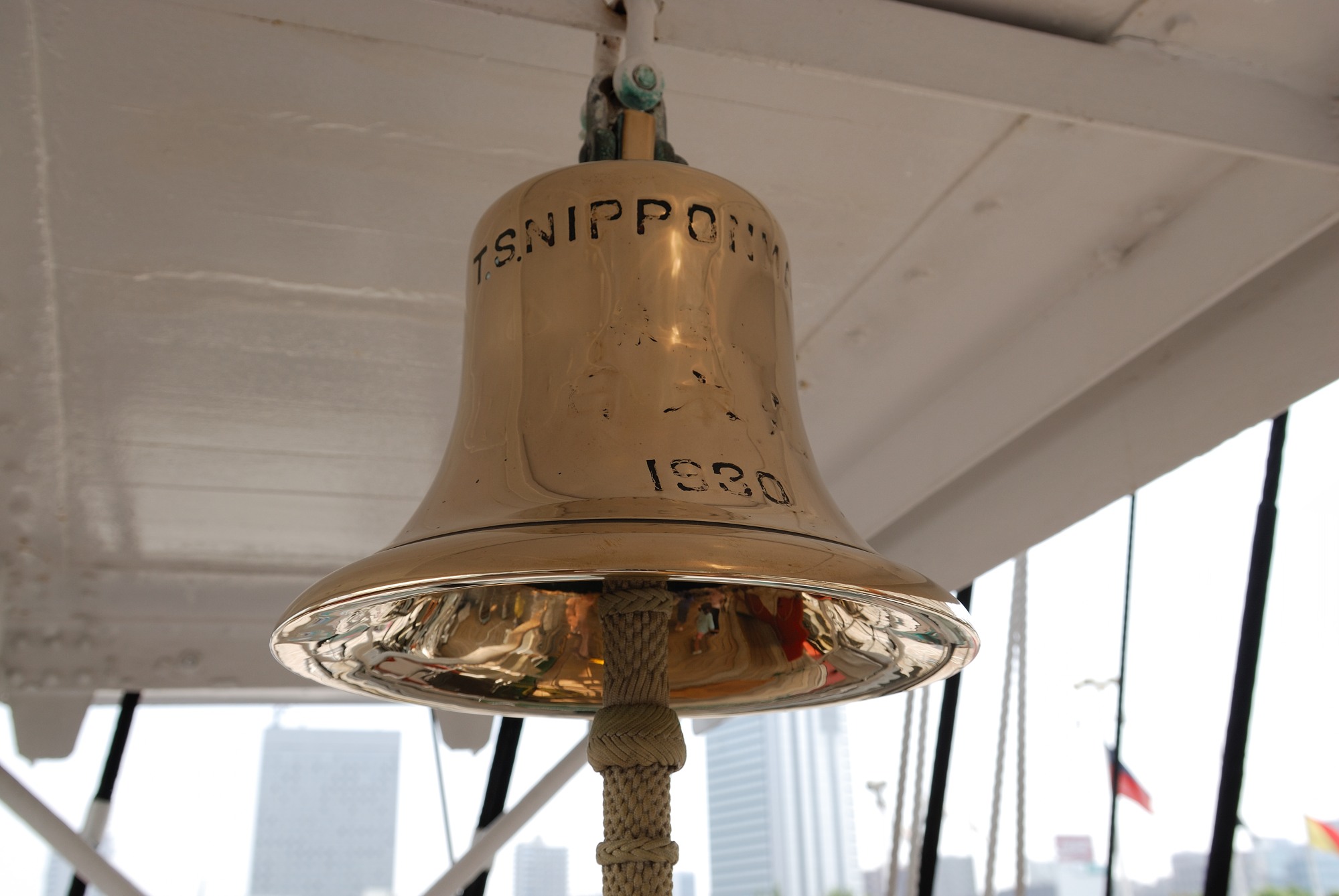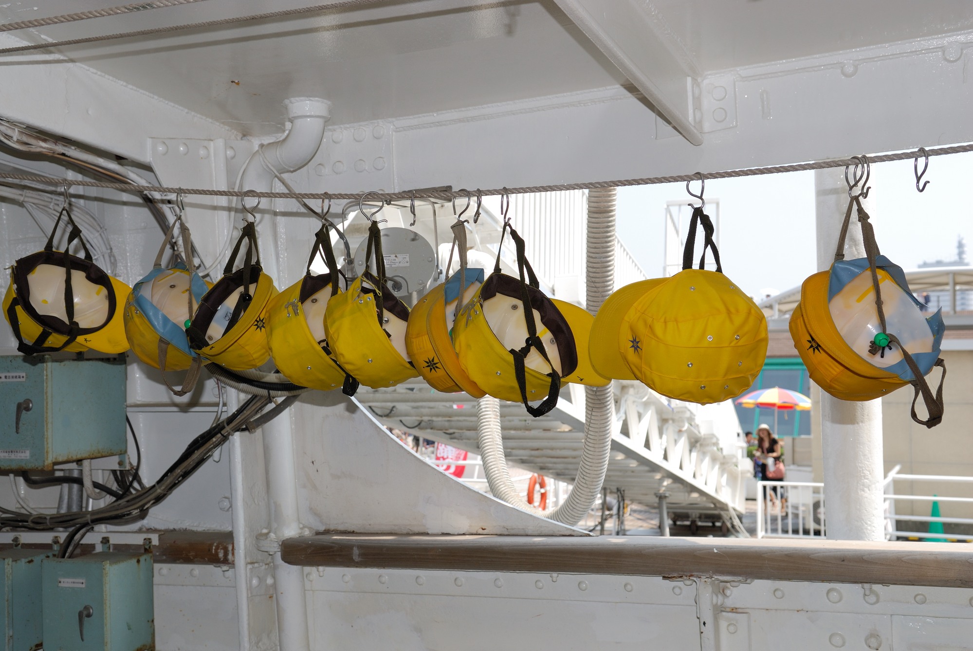 乗り込んですぐ目に付くのは,訓練生用と思われる黄色い帽子が下げられているところでした。また少し先行くと,時計代わりに鳴らした金色の鐘があります。当時は時計がまだ普及していなかったので、この鐘を定期的に鳴らしていたそうで,そのためこの鐘は時鐘(Time Bell)と呼ばれました。