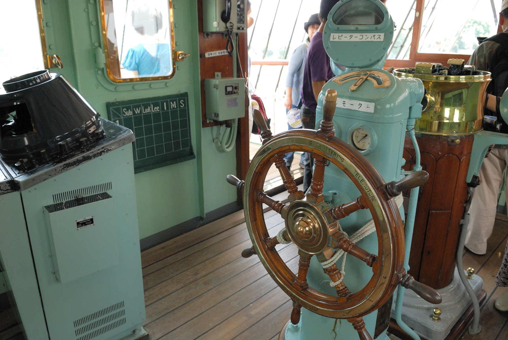 その先には操舵室があり,船の操舵機があります。ここで訓練生の人たちは「おもかじいっぱ~い」などと言いながら舵取りをしたのでしょう。操舵室は意外と狭かったのが印象的でした。