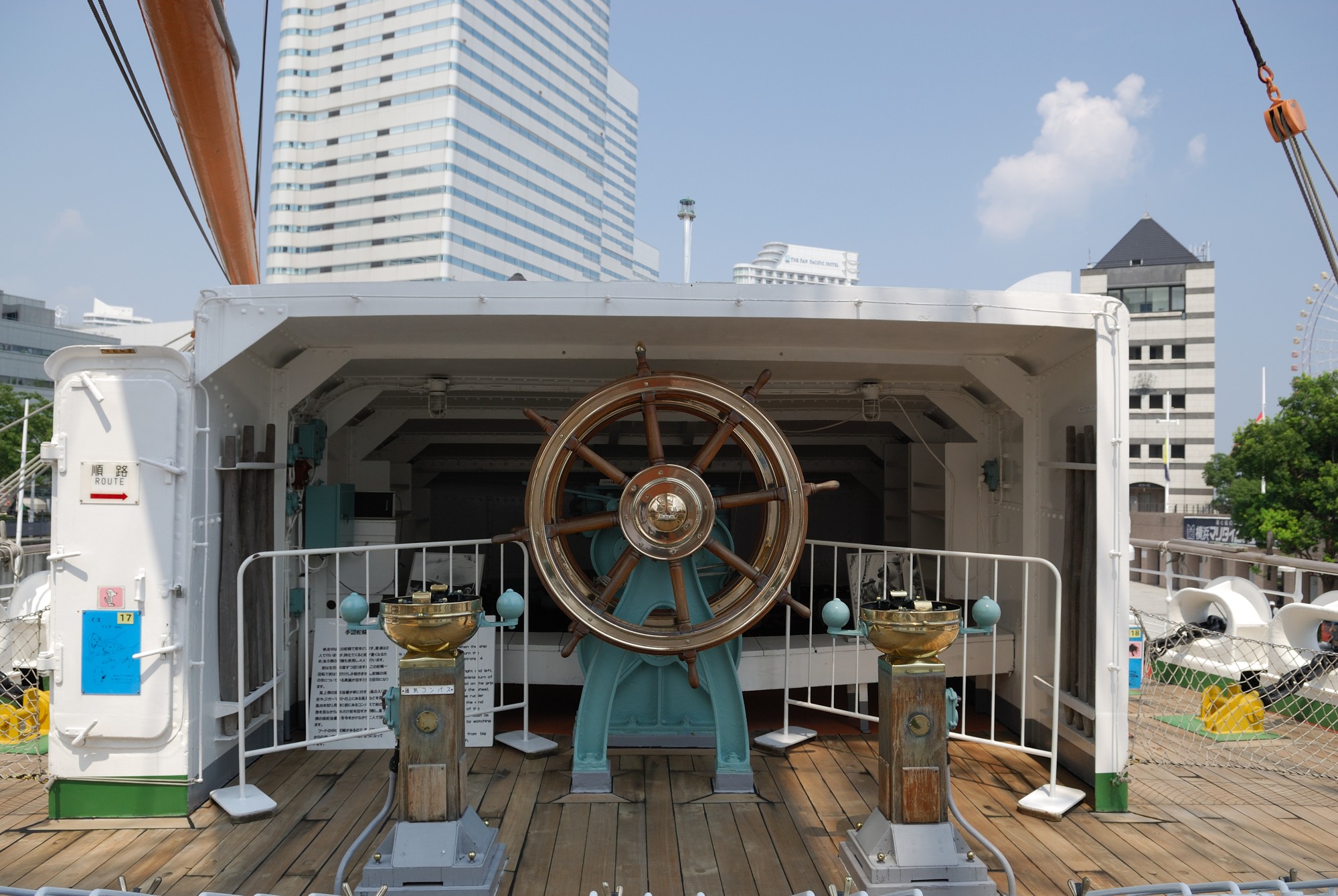 マストの上には日の丸があり,その合間からは青い空と高層ビルが見えます。また,船尾にも操舵機がありました