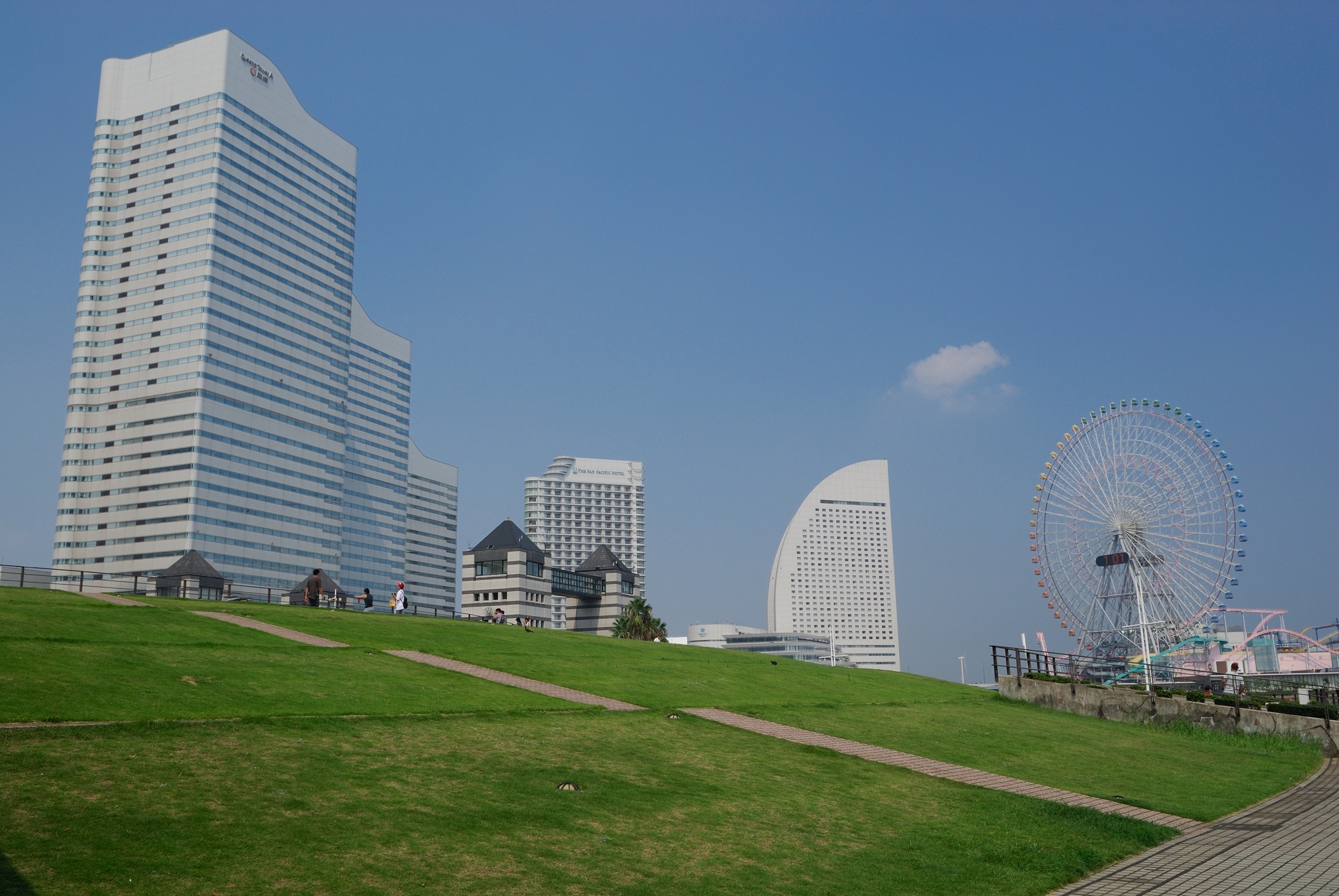 MM21というと,完成時には東洋一高いというランドマークタワーが一世を風靡しましたが,その他にも,帆船の日本丸,よこはまコスモワールドの大観覧車,新しいところでは赤レンガ倉庫などで有名です。海沿いには変わった形をしたホテルなどが立ち並び,奥には大展示施設であるパシフィコ横浜があります。
