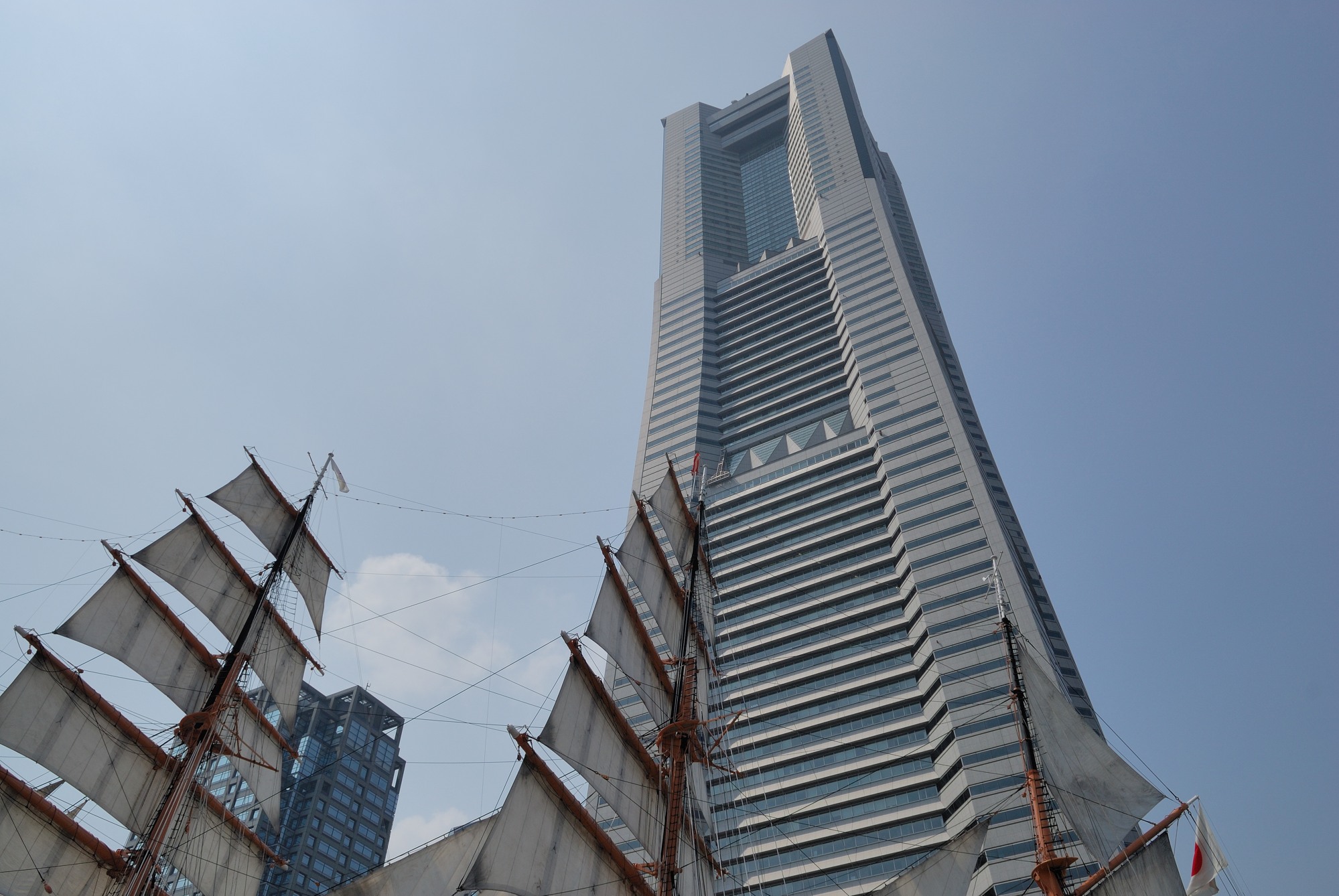 少し歩いただけで汗がたくさん噴出してきましたが,ほどなくランドマークタワーの下に到着します。下から見上げるランドマークタワー,確かに非常に大きいビルです。70階建,高さ296m。高さ今では上海などのビルに東洋一の座を奪われていますが,完成時東洋一の高さはさすがです。最上階の展望台に登れば眺めは最高なのでしょうが,本日は下から見上げるのみにします。