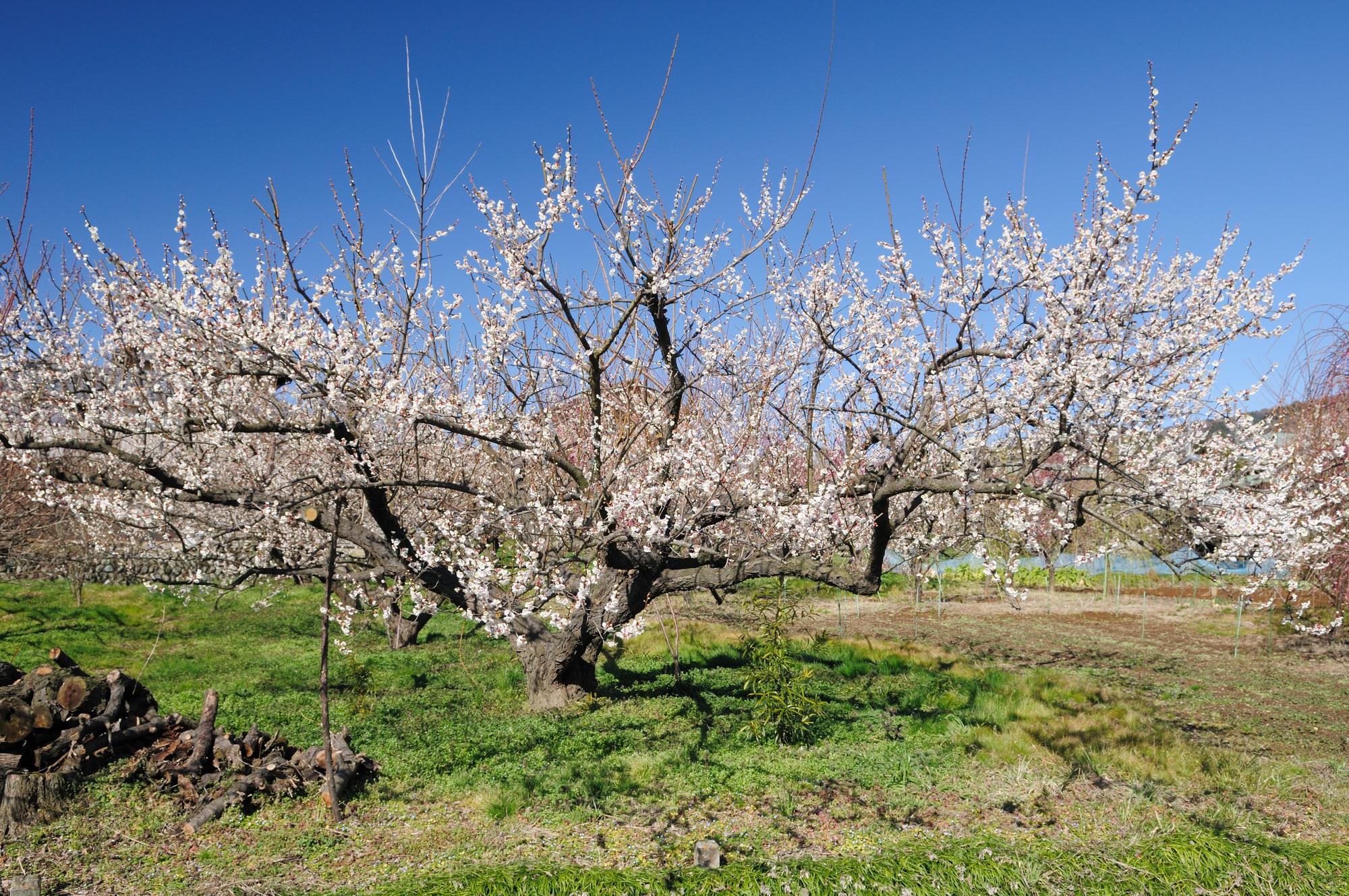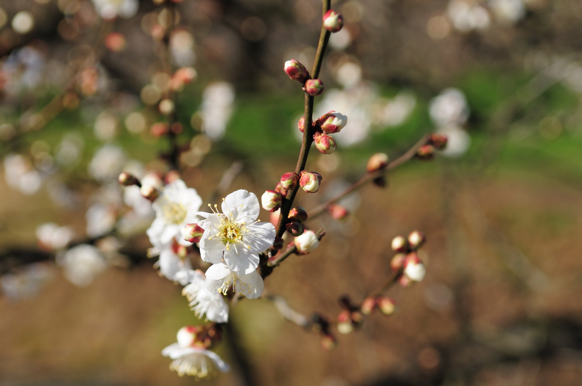 さて梅林の方へ歩いていきます。梅林というだけあって,通路の両側に実の多くの梅が咲き乱れており,非常に綺麗でした。このあたりは暖かいのでしょうか,2月初旬というのにほぼ満開です。快晴の青空に映える梅の花も綺麗,近くで見るともと綺麗,感動しながら歩いてゆきます。ここは白い梅が中心ですが紅梅もあります。