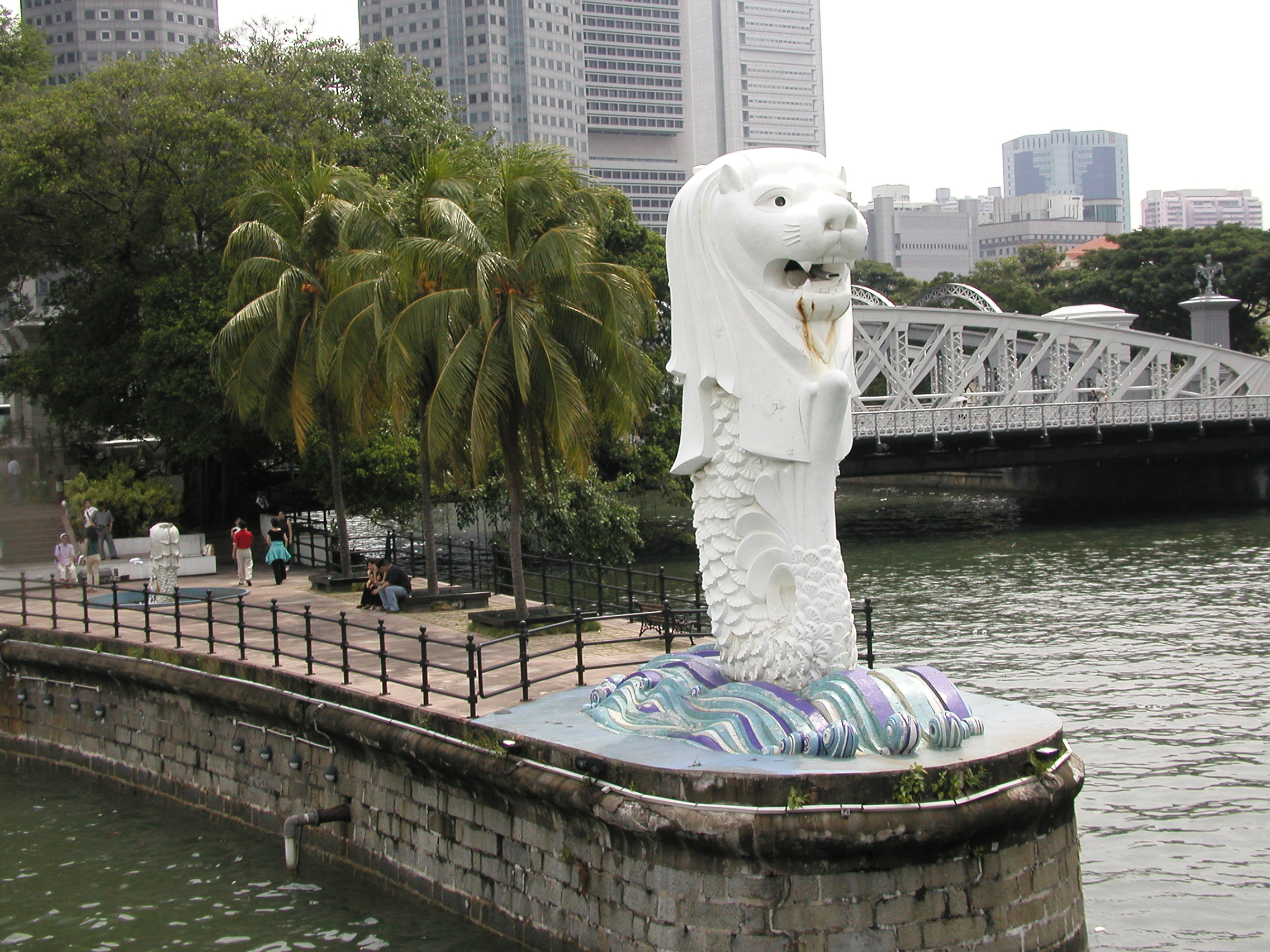 このマーライオンは2002年4月に橋の向かいに引越してポンプも修理したため、今ではダバダバと水を吐くようになりました。