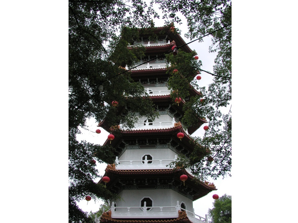 途中には珍しい形の中国風東屋もあります。そこを過ぎて歩いてゆくと五重塔のふもとに来ますが、ここはちょっとした広場になっており緑がとても綺麗でした。