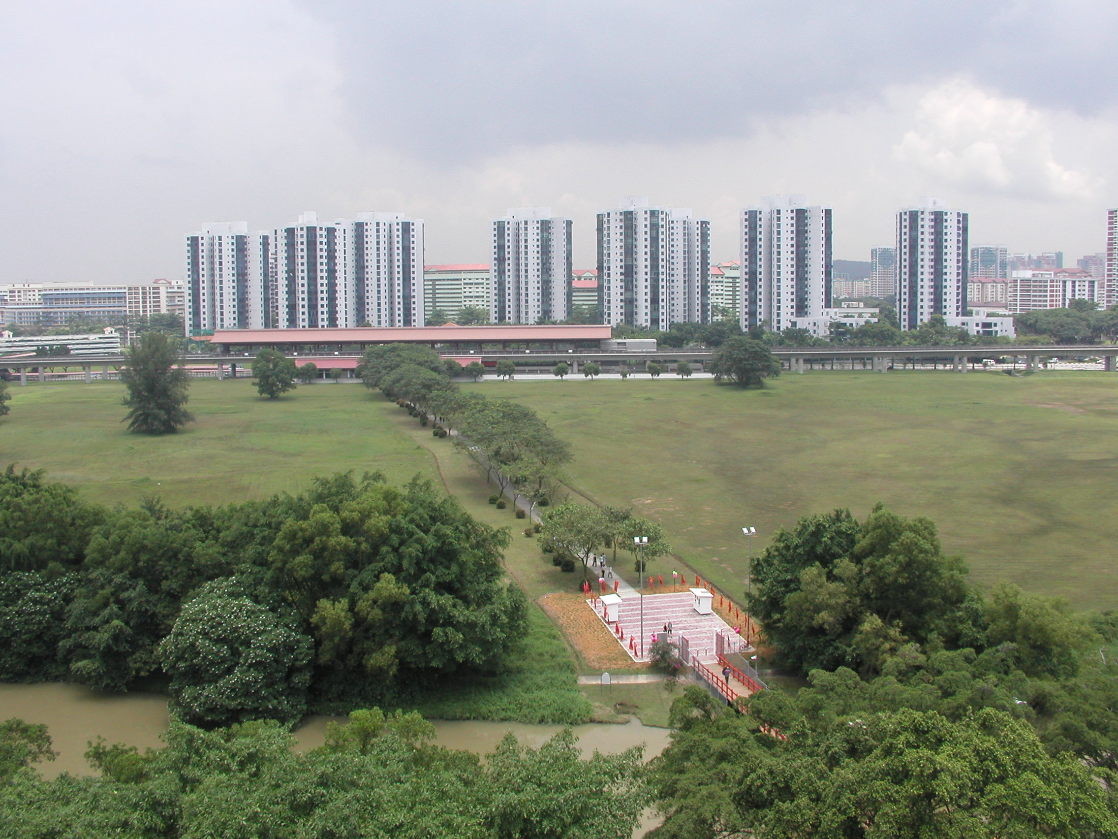 足元の中国庭園を望むと色鮮やかな建物や飾りが見え、反対方向にはMRTチャイニーズガーデン駅とその向こうにそびえ立つHDBを見ることが出来ます。しばらくここで涼んでいました。