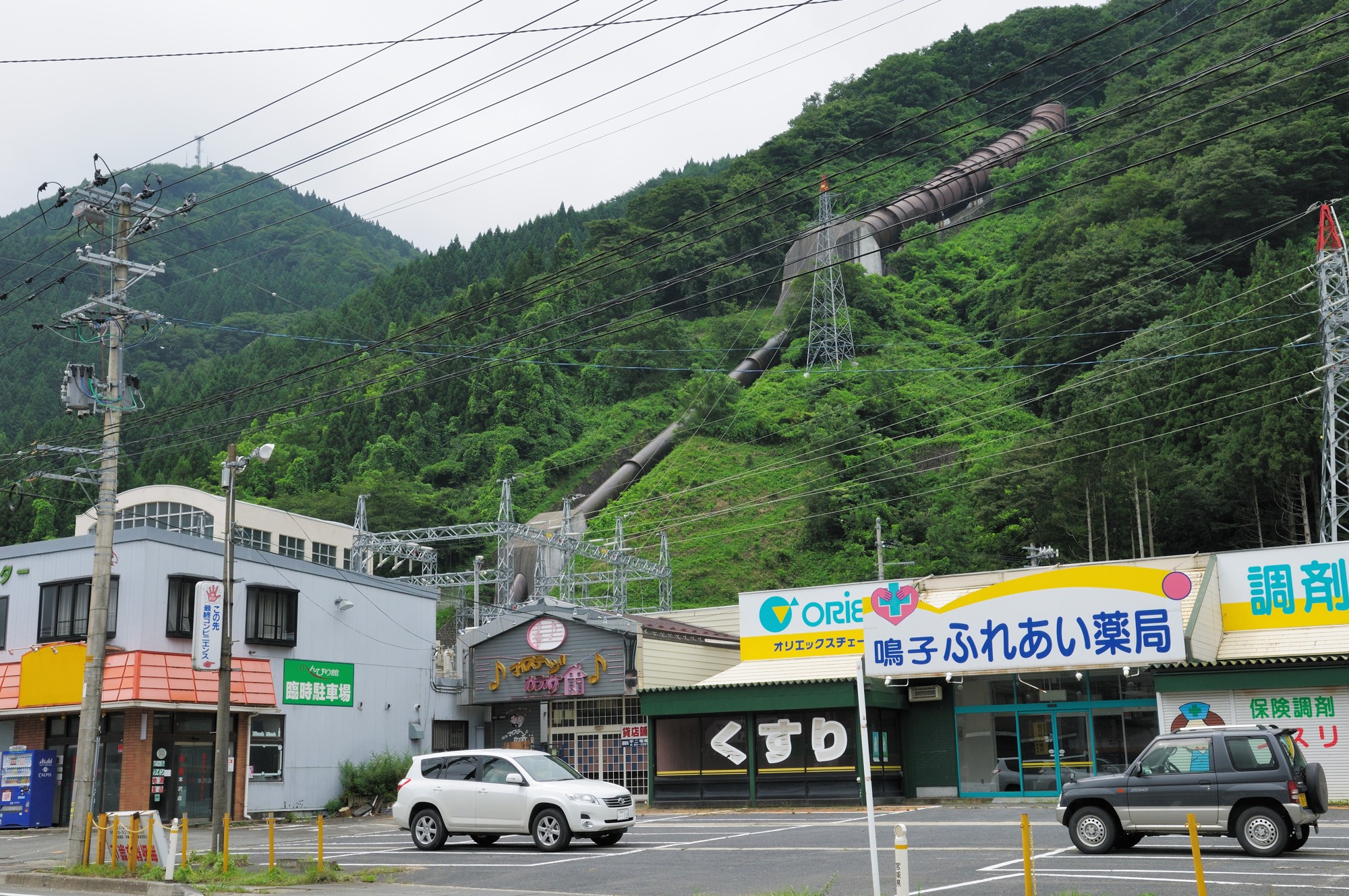 さてさて、鬼首へ向かい車をひまわりの丘より北へ走らせます。一般道を約1時間も走ればそこは鳴子温泉です。温泉の入り口のあたりから、川を渡り山道を進むと鬼首に行きます。その入り口あたりには、東北電力の小さな水力発電所があり、山すそには水を落とす独特のパイプがあり、鬼首への目印となります。そこを過ぎると急な山道になり、そこからは向こうに鳴子温泉が見えます。