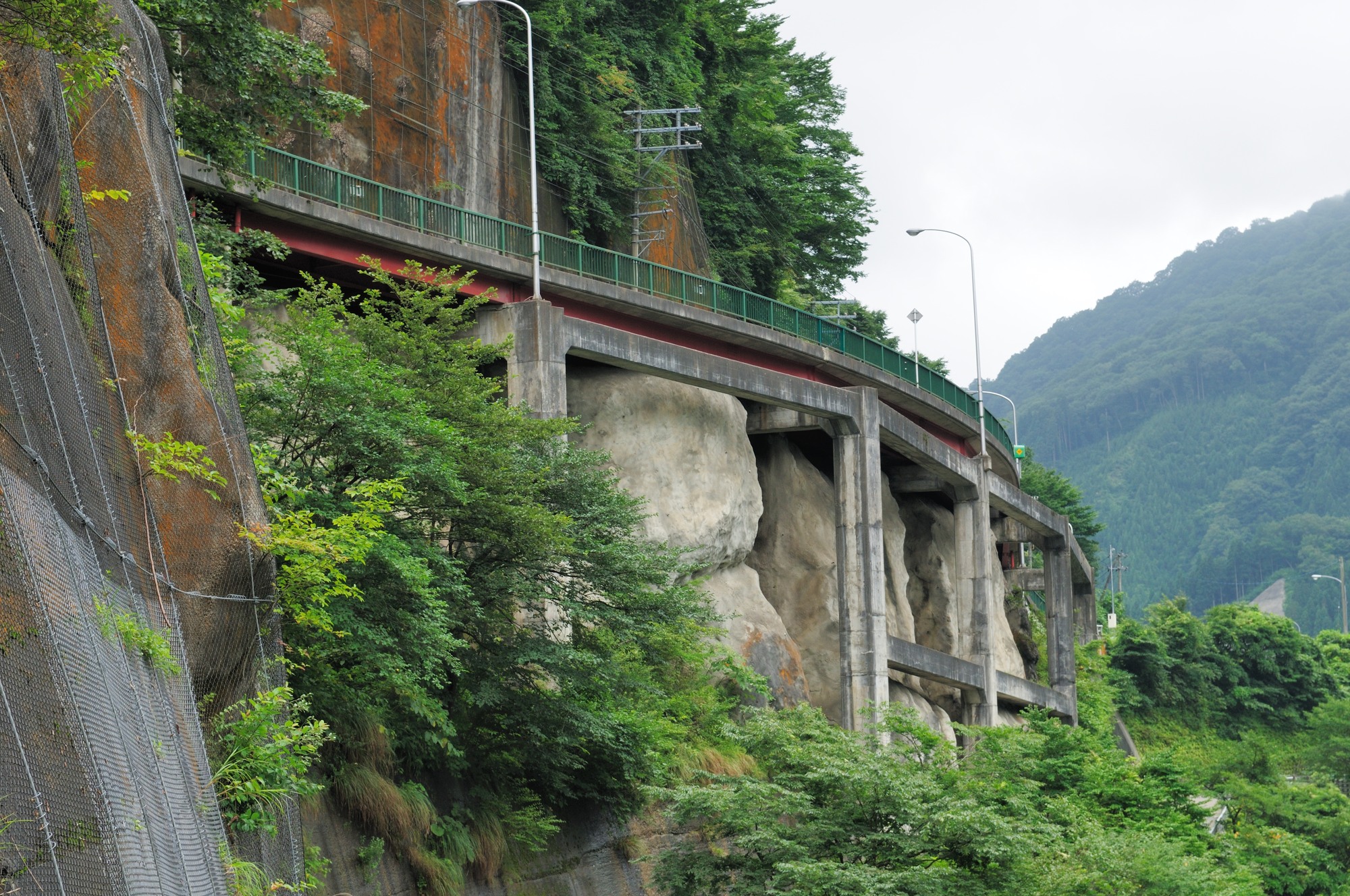 ダムの少し手前に駐車場があり、そこで車を止めるとダムに向かう500mほどの短い遊歩道があります。そこからは、すぐ近くでダムを見ることが出来る上、ダムの上を歩くことも出来ます。遊歩道のすぐ上を国道が走っていますが、下から見るといまにも崩れそうで怖い感じがします。ダムの向こうには広いダム湖が広がります。