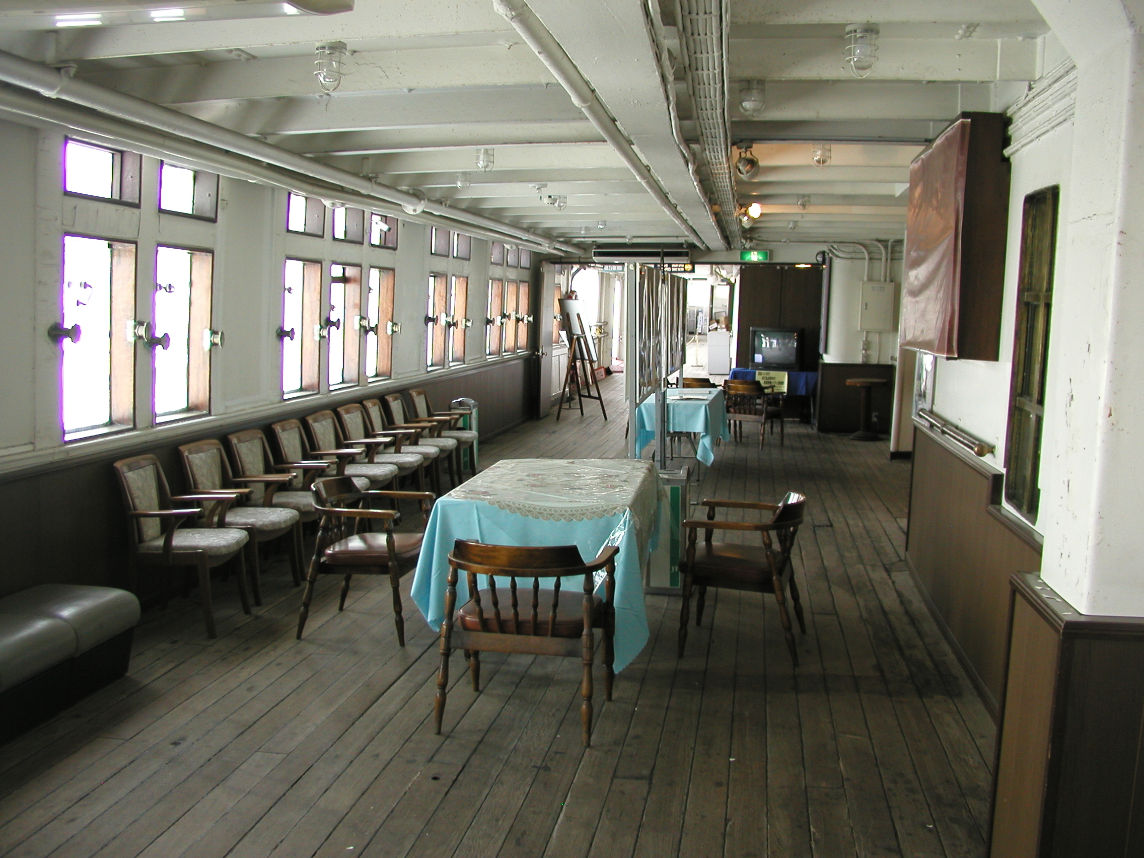 そこを過ぎたら今度はデッキの方へも回ってみます。デッキにつながる通路もなかなかいい雰囲気を醸し出しています。このあたり、流石は昔の豪華客船なんだなあ、という印象を受けます。