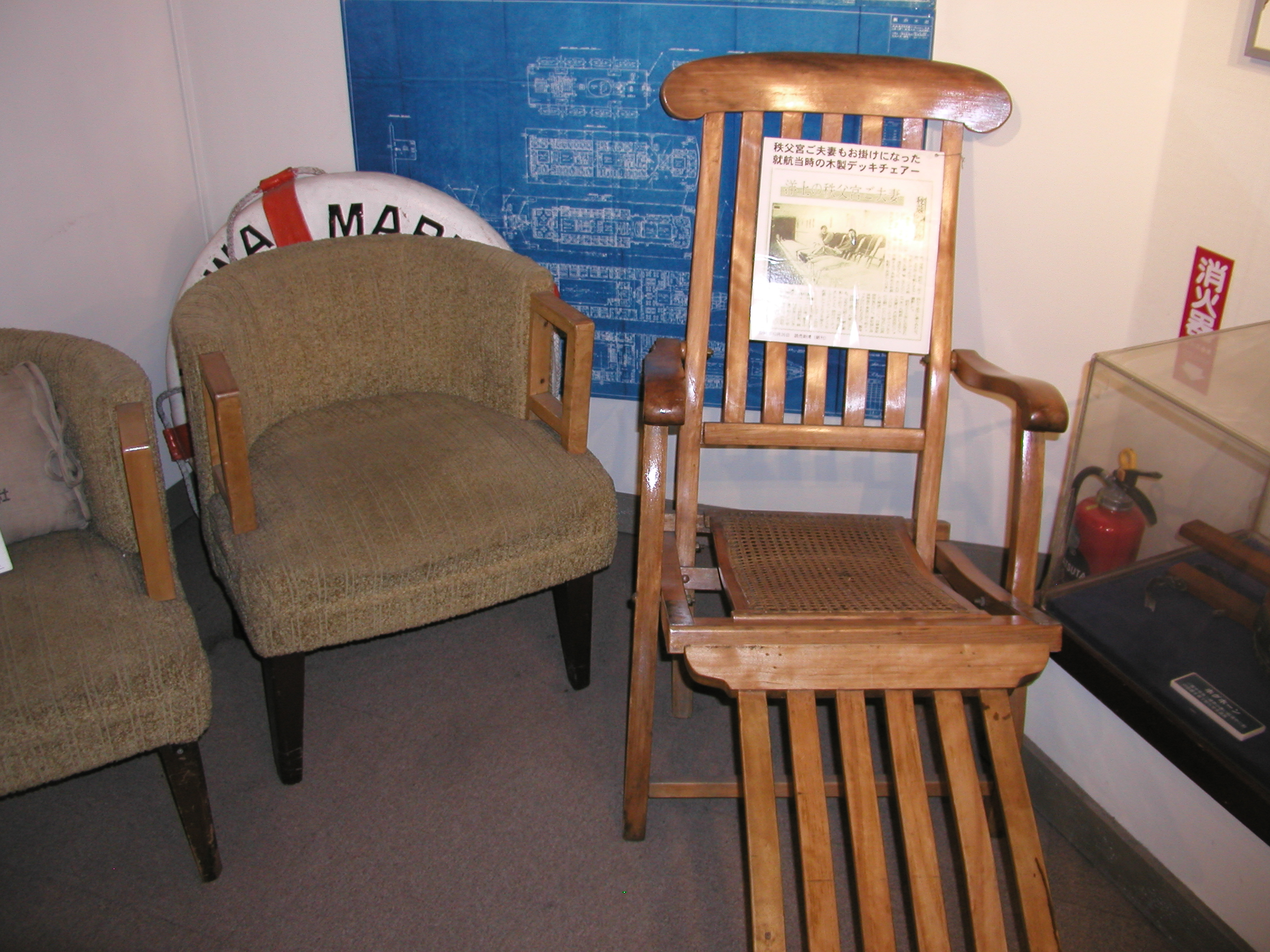 エンジンルームを見たあとは船内をぶらぶら歩きます。昔の客船の模型を飾っているコーナーには、あのタイタニック号も飾ってありました。また、秩父宮様が乗船された時に使用したチェアもあります。さらに操縦桿の脇で船長さんなどの服をレンタルして記念撮影出来るところもあります。子供連れの方にはいいかもしれません。