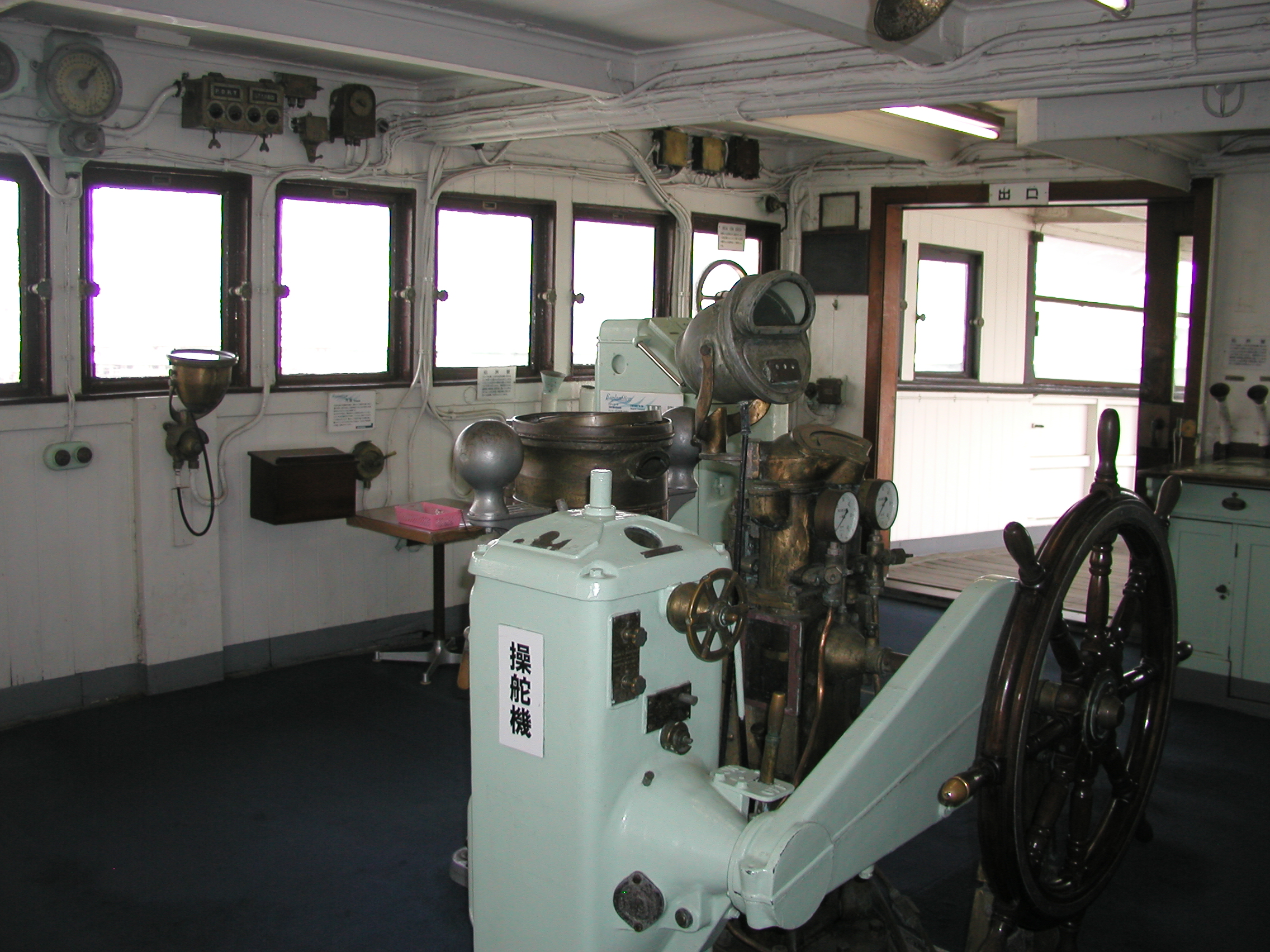 入ってみると、大きな操舵機がありました。その位置は前面の窓から結構離れていて、こんなんで前方が見えるのだろうか、と思ってしまいます。当時はこの舵取りをしながら「面舵(おもかじ)いっぱ~い」「取り舵~」とかって話していたことでしょう。