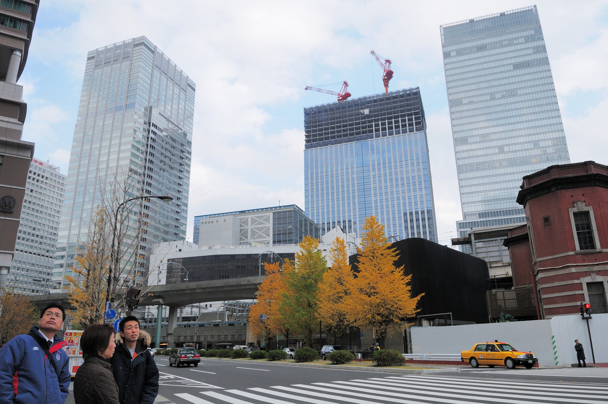 そこから左手を見ると,中央線の高架の向こうには,最近出来たばかりの八重洲のグラントウキョウ・ノースタワーが右に見えます。ここには大丸が新しく移転したはずなので,一度は行ってみたいと思っていますが,なにぶんにも出来たばかりなので当面は混雑していると思い,時間を置いてから見に行くつもりです。高架の下にはさりげなくイチョウの木が綺麗に紅葉して立ち並んでいました。