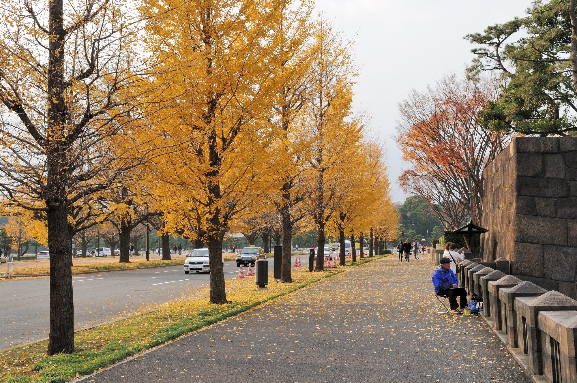 お次は皇居のお堀の方に向かいます。東京駅正面には,和田倉門があります。このあたりは,皇居方面より流れてくる人が多く歩いていて,街路のイチョウの紅葉の写真を皆で撮影していました。このあたりのイチョウも綺麗です。特に良かったのは,歩道に散っているイチョウの葉でしょうか。人がいなくなった時を狙い,それを撮影しました。