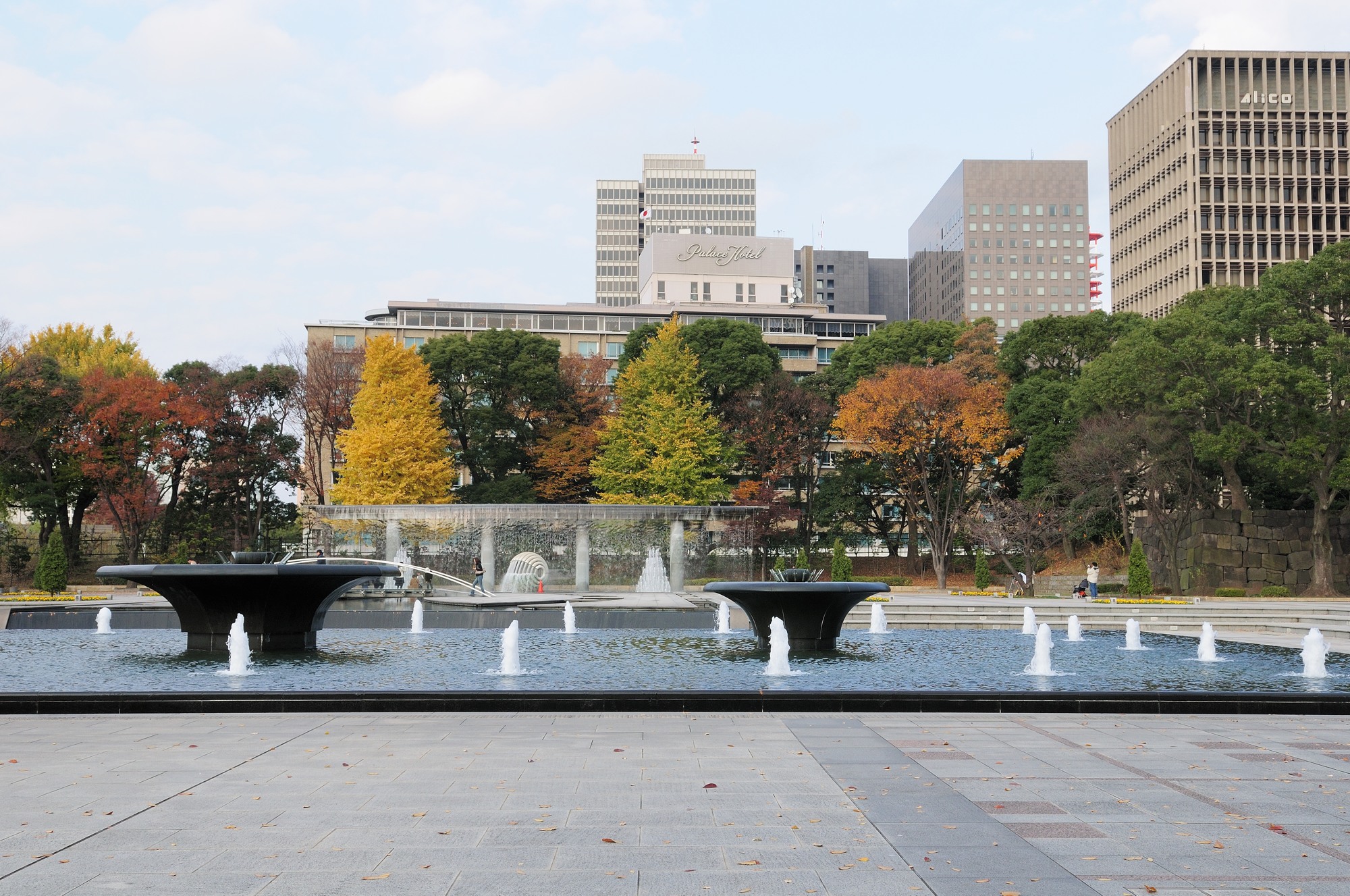 さて更に進むと噴水の向こうにパレスホテルが見えます。手前のさりげない紅葉も綺麗ですね。う~ん,美しい。