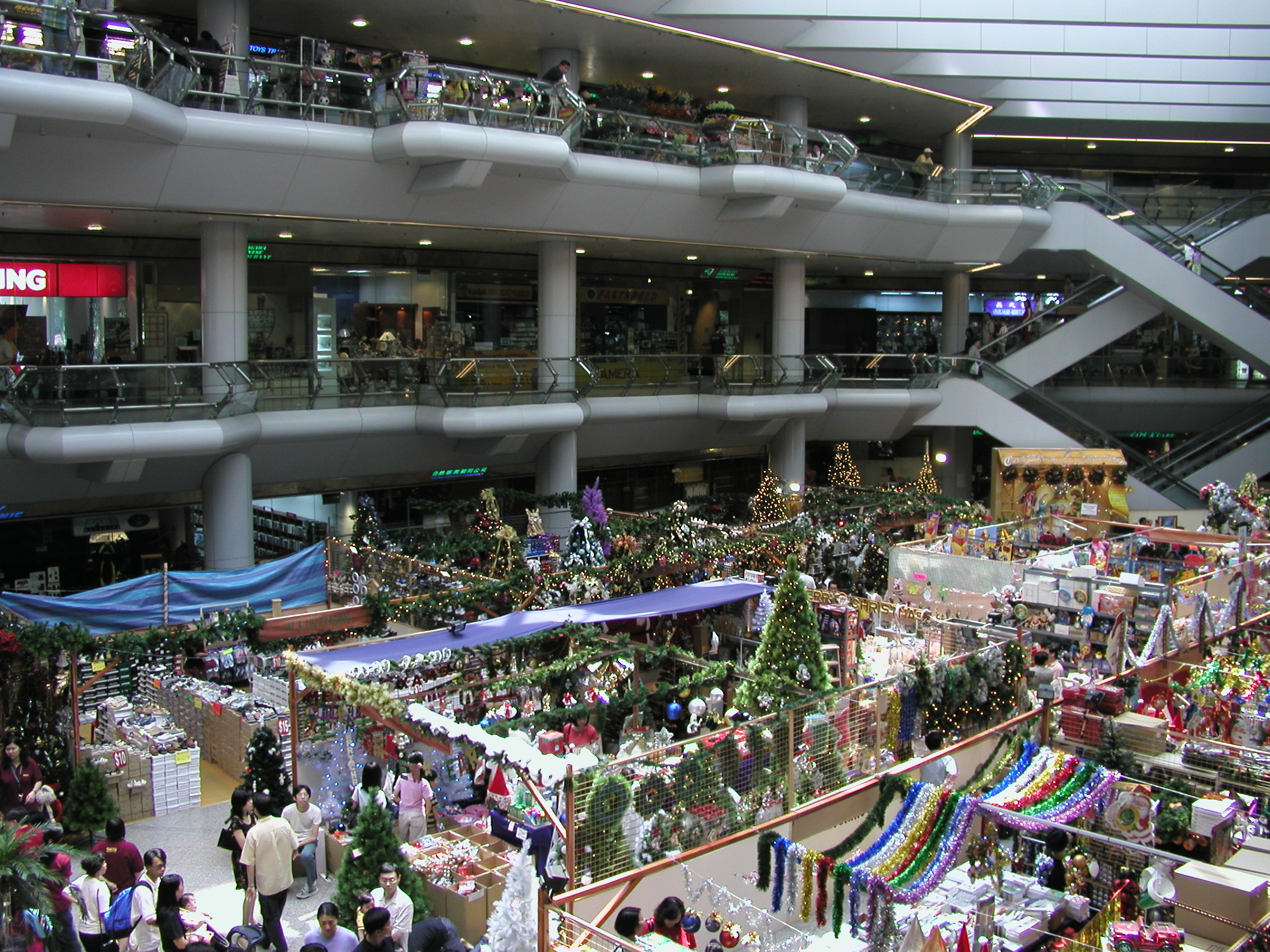 入ってみるとそこは他のショッピング・センターと同じような作りになっており、真ん中に大きな吹き抜けがありその広場でクリスマス用品をたくさん売っています。回りには1階~3階まで小さな店が並び、ほとんどがやはりクリスマス用品を売っています。