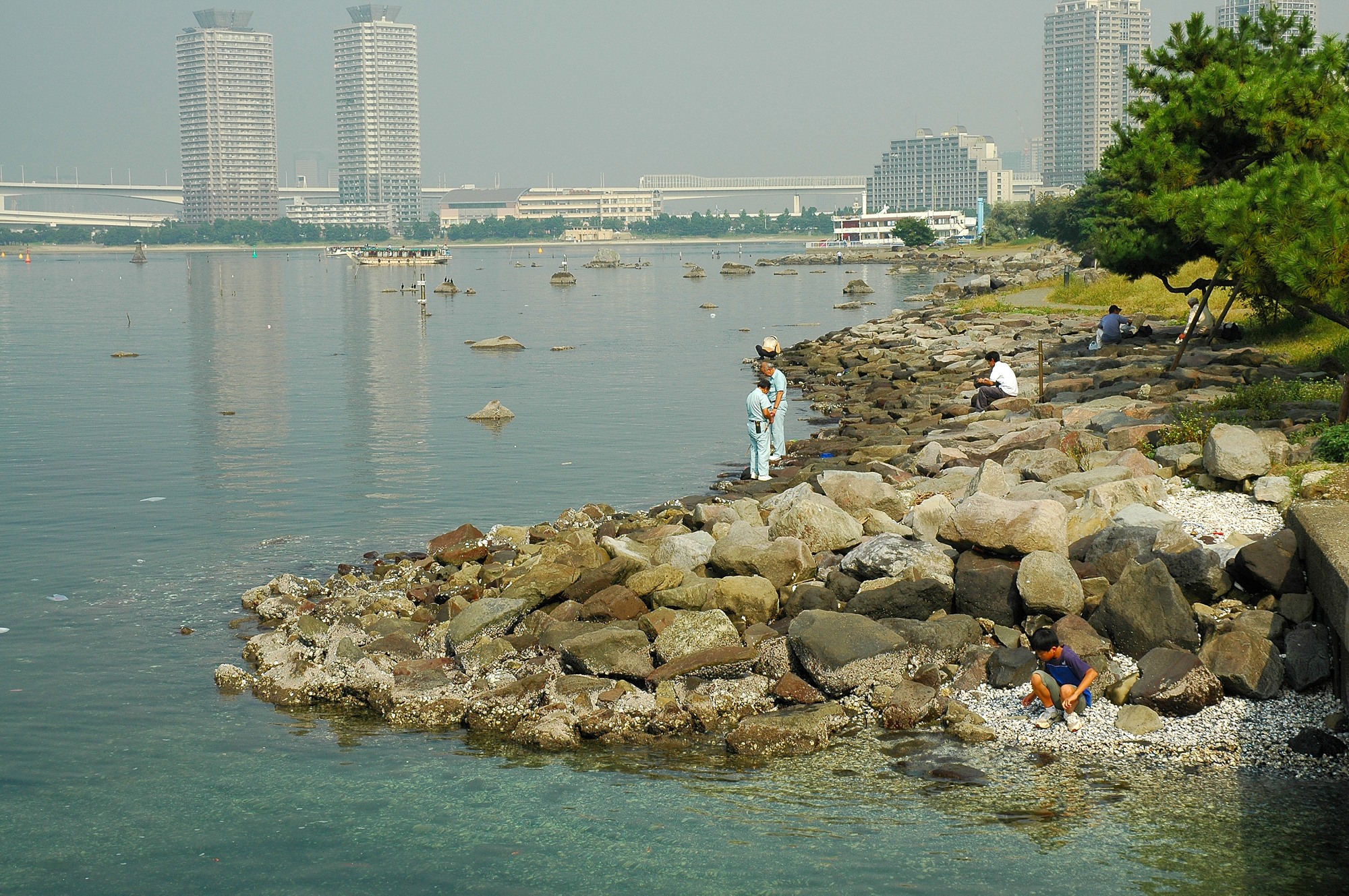 湾岸道路を降りてすぐ、懐かしのフジテレビ本社の独特な建物が見えてきます。その先の、船の科学館の近くの駐車場に車を止め、海沿いの公園に歩いていきました。